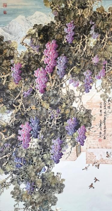 葡萄园是这幅画作焦点。画葡萄采用了中国画的写意无骨技法,精妙传神、用笔沉酣,珠粒饱满、晶莹剔透,将葡萄的秉性与韵味一气呵成。