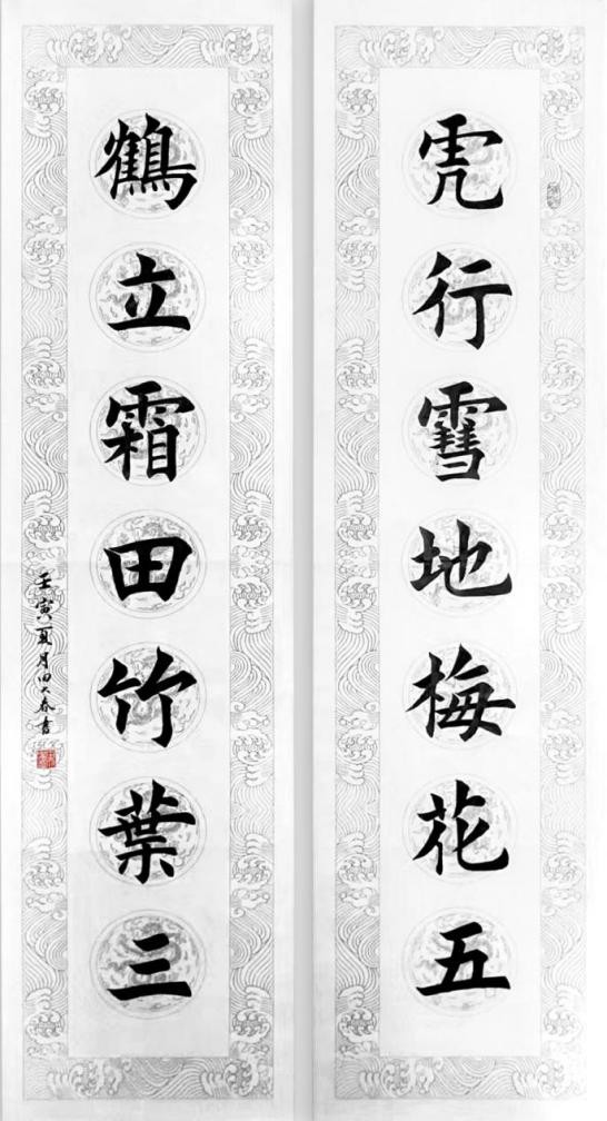 作品名称:虎行雪地梅花五,鹤立霜田竹叶三(楹联、欧体大楷)