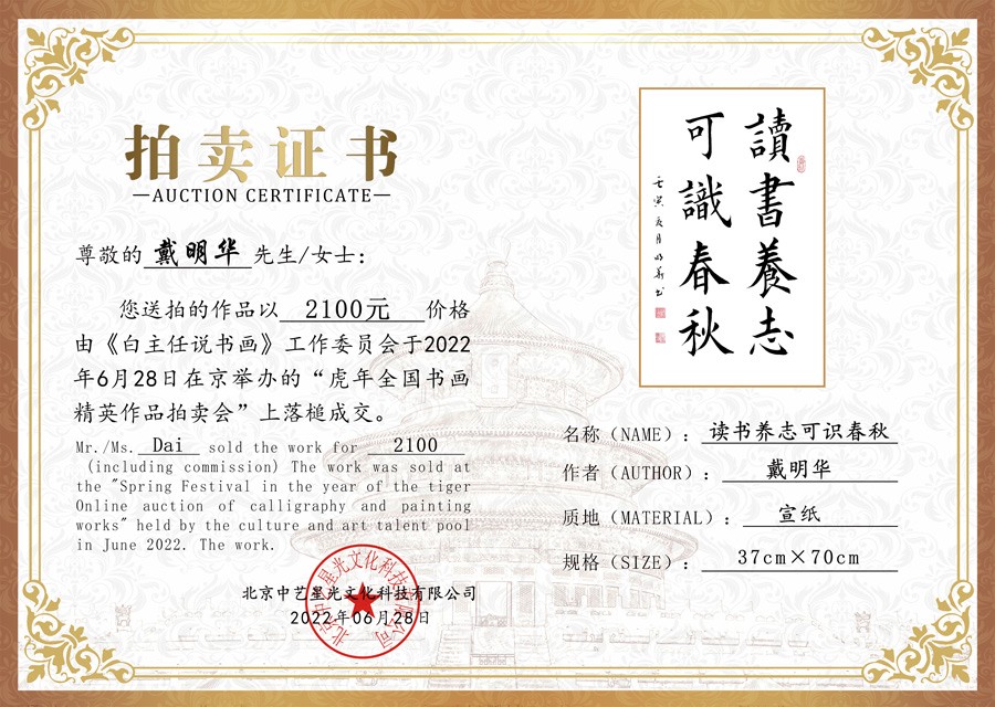 由中国文化艺术人才库组织的“虎年全国书画精英作品拍卖会第23期”于6月28日在京举行。书法家戴明华的作品《读书养志可识春秋》在多轮激烈的竞拍中以2100元被藏友收藏。
