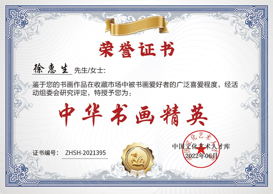 鉴于书法家徐惠生的作品在收藏市场中被书画爱好者的广泛喜爱程度,经活动组委会研究评定,决定将其作为“中华书画精英”,面向社会大众予以宣传和推广。