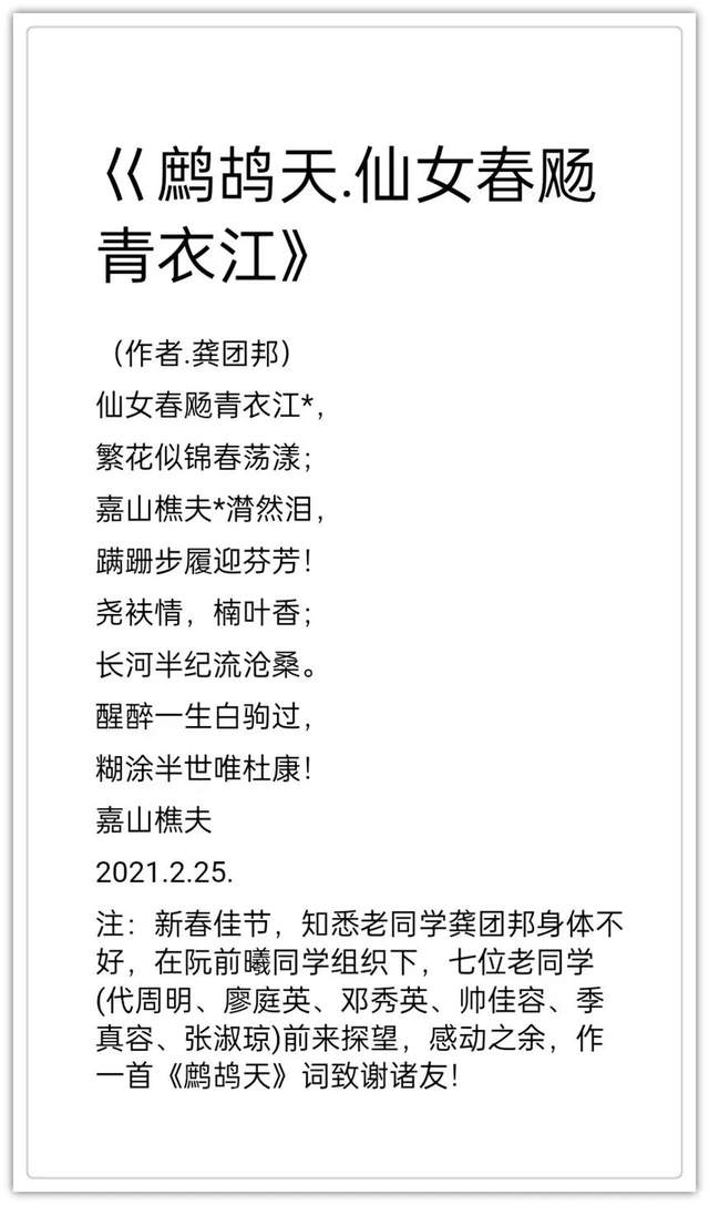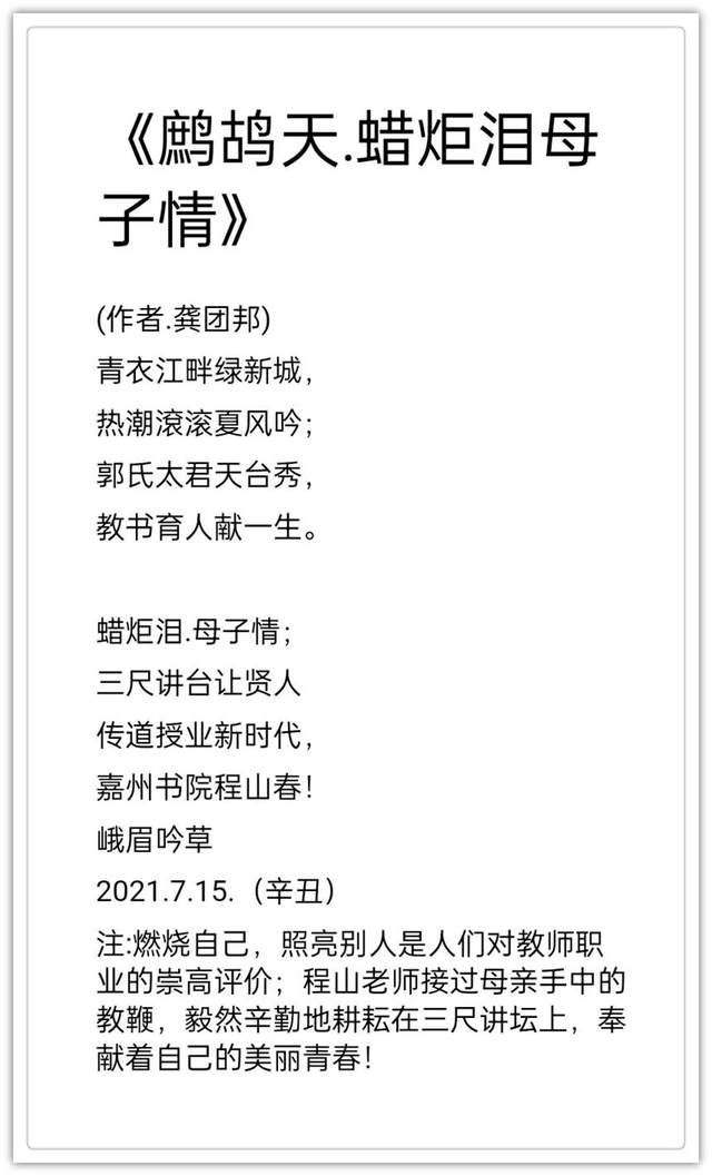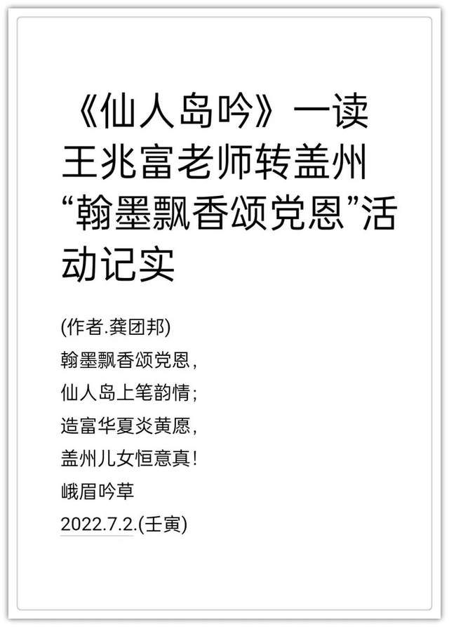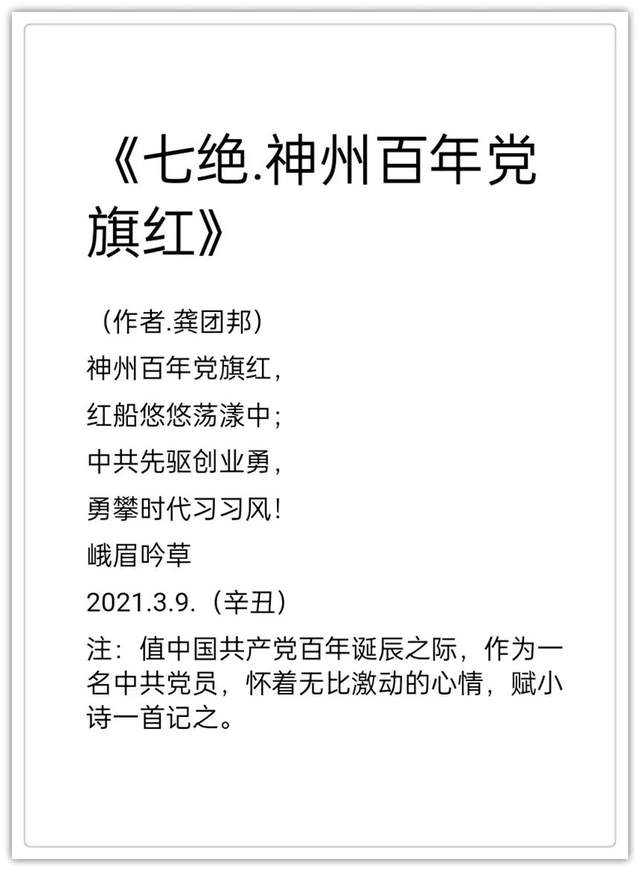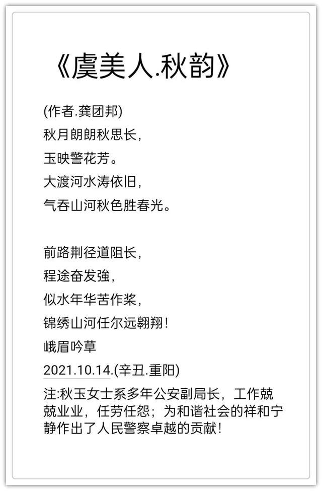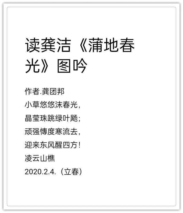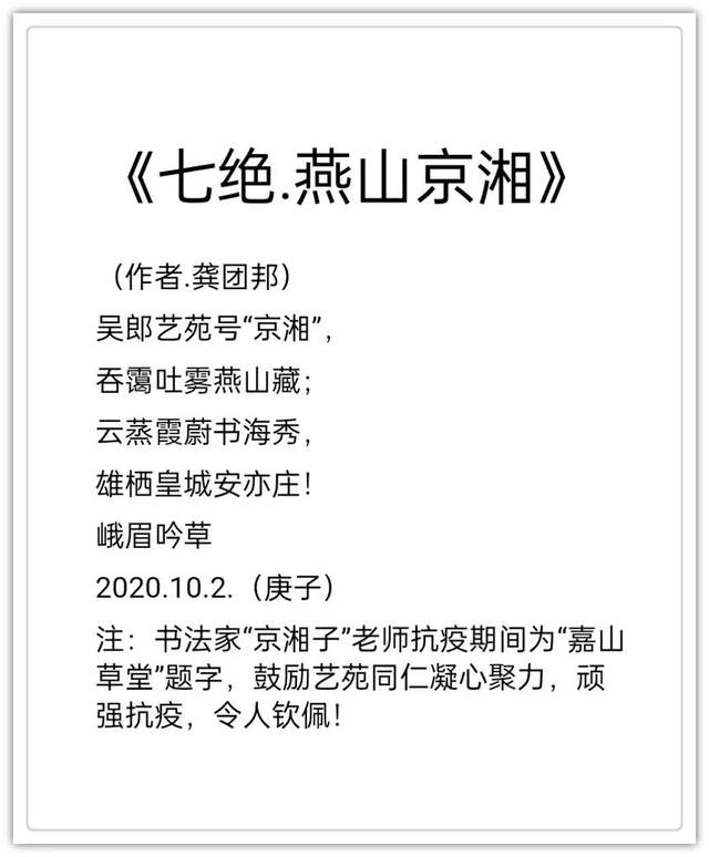 2020年作品入编中国楹联学会《联墨艺术宝鉴》(中国诗词楹联出版社)。2020年古体诗词作品《虞美人.嘉山秋色》, 《踏莎行嘉山冬韵》,《沁园春.嘉山情韵》被中国文联、中国作协、中国美协联合编篡的大型资料汇编《中国艺术榜样年鉴》所收录(目前中国唯一一部综合体现国家文化力的大型文献一编者。2021年作品入编一带一路专刊《中外艺术》一-龚团邦(国际刊号:Issn2710-4907),被一带一路旅游促进会骋为终身顾问(骋书编号:20210314) ;