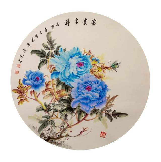 蝴蝶在牡丹之上翩翩起舞,寓意“捷报富贵”。