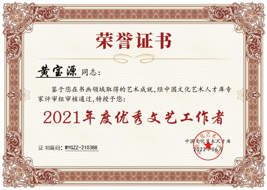 鉴于黄宝源先生在书画领域取得的优异成就,经中国文化艺术人才库专家评审组审核通过,授予其“2021年度优秀文艺工作者”荣誉称号。
