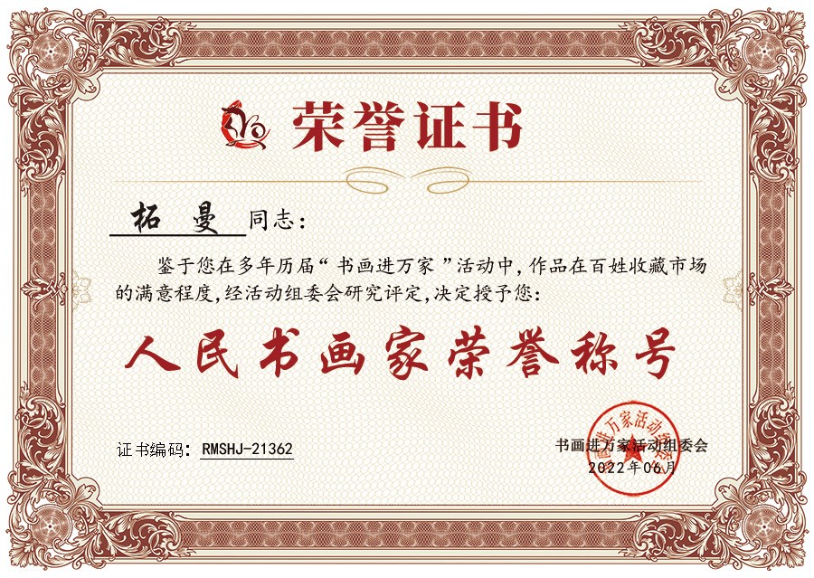 鉴于柘曼女士在多年历届“书画进万家”活动中,作品被百姓收藏市场接受的满意程度,经活动组委会研究评定,决定授予其“人民书画家”荣誉称号。