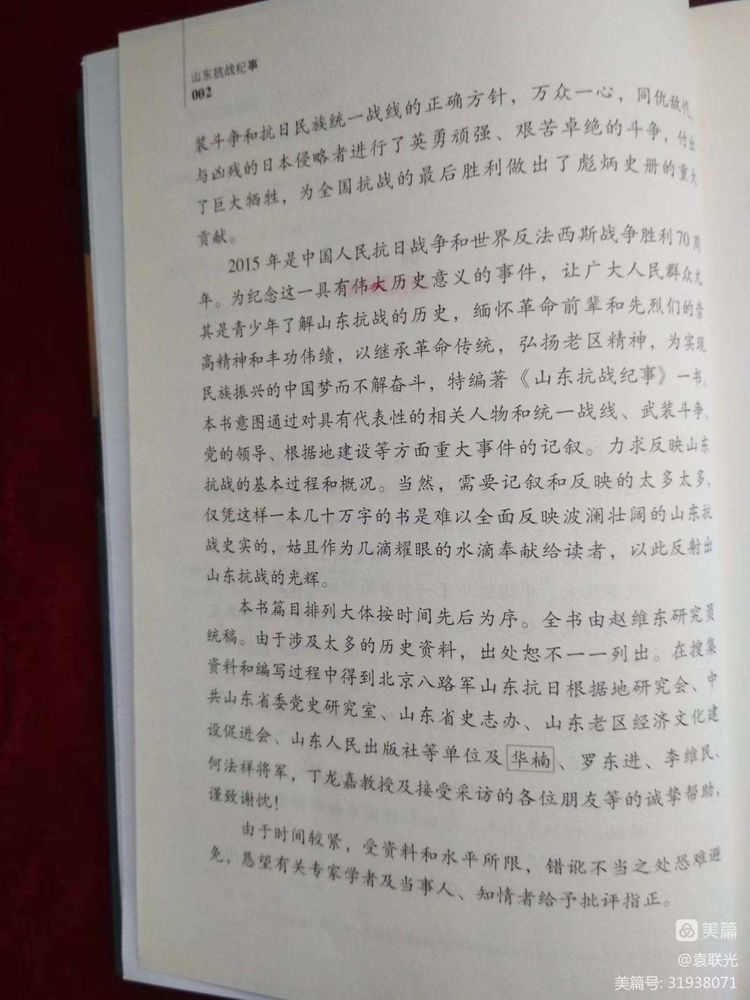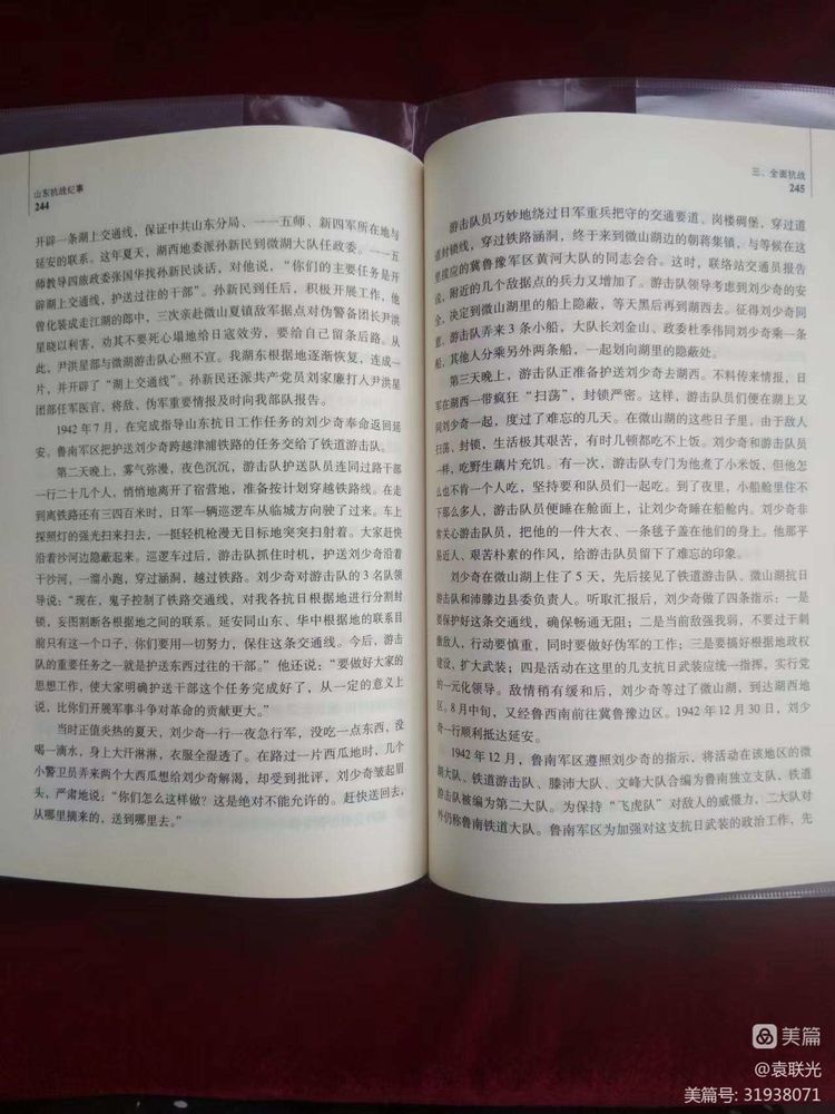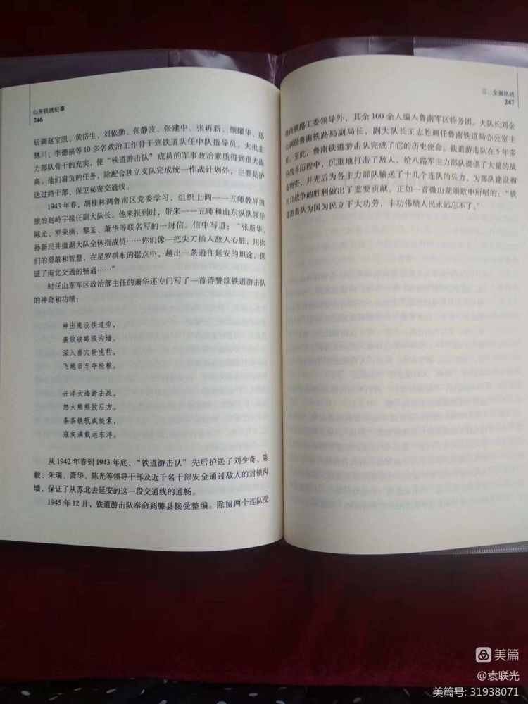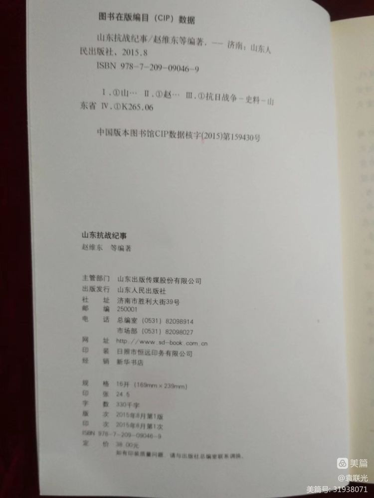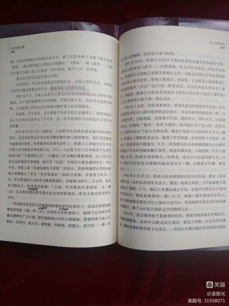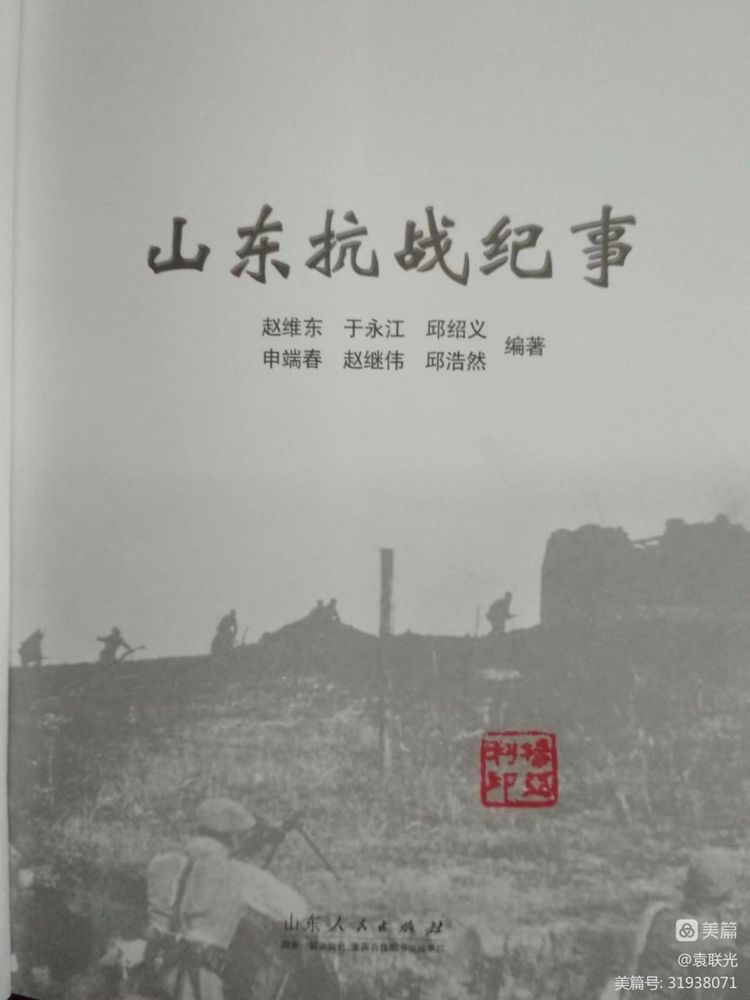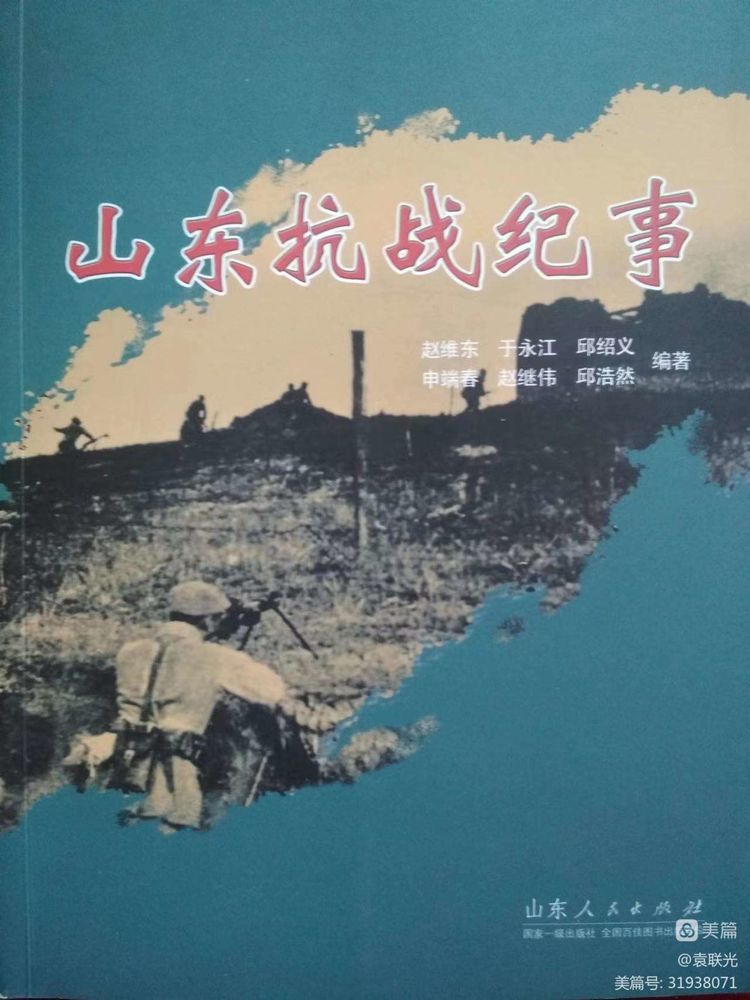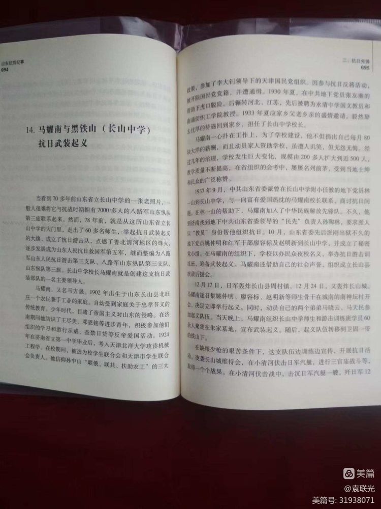 2015年是中国人民抗日战争和世界反法西斯战争胜利 70周年。为纪念这一具有伟大历史意义的事件,让广大人民群众尤其是青少年了解山东抗战的历史,缅怀革命前辈和先烈们的崇高精神和丰功伟绩,以继承革命传统,弘扬老区精神,为实现民族振兴的中国梦而不懈奋斗,特编著《山东抗战纪事》一书。该书意图通过具有代表性相关人物和统一战线、武装斗争、党的领导、根据地建设等方面重大事件的记叙,力求反映山东抗战的基本过程和概况。该书的第二部分“抗日先锋”的第三部分“全面抗战”记述了山东英烈的光辉事迹。这本书第二部分“抗日先锋”第14条“马耀南与黑铁山(长山中学)抗日武装起义”记述了我校原副校长马立明父亲的事迹。这本书的第三部分“全面抗战”第 37条“铁道游击队传奇”记述了我校杜冬云同志的父亲铁道游击队政委杜季伟的事迹。
