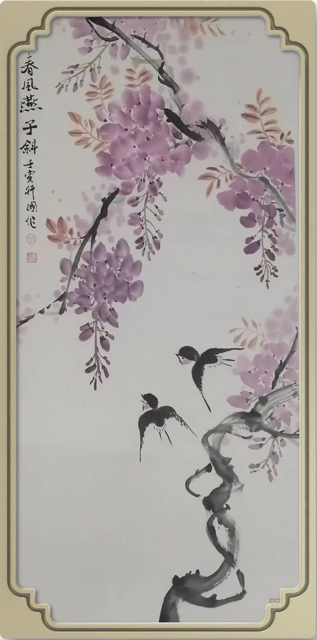 凌霄花放俏依依,蝶飞绿叶青枝。莺歌燕舞伴新诗,喜报佳期。