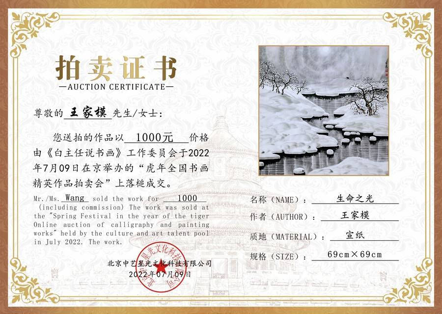 由中国文化艺术人才库组织的“虎年全国书画精英作品拍卖会第二十五期”于7月9日在京举行。画家王家模作品《生命之光》在多轮激烈的竞拍中以1000元被藏友收藏。在本次书画拍卖会上,文化艺术人才库遴选了多名全国优秀书画家的作品送拍,有来自全国各地的上万名人次的书画爱好者和藏友进行了在线观看和参与作品的竞拍,多名书画家的作品竞拍成交。