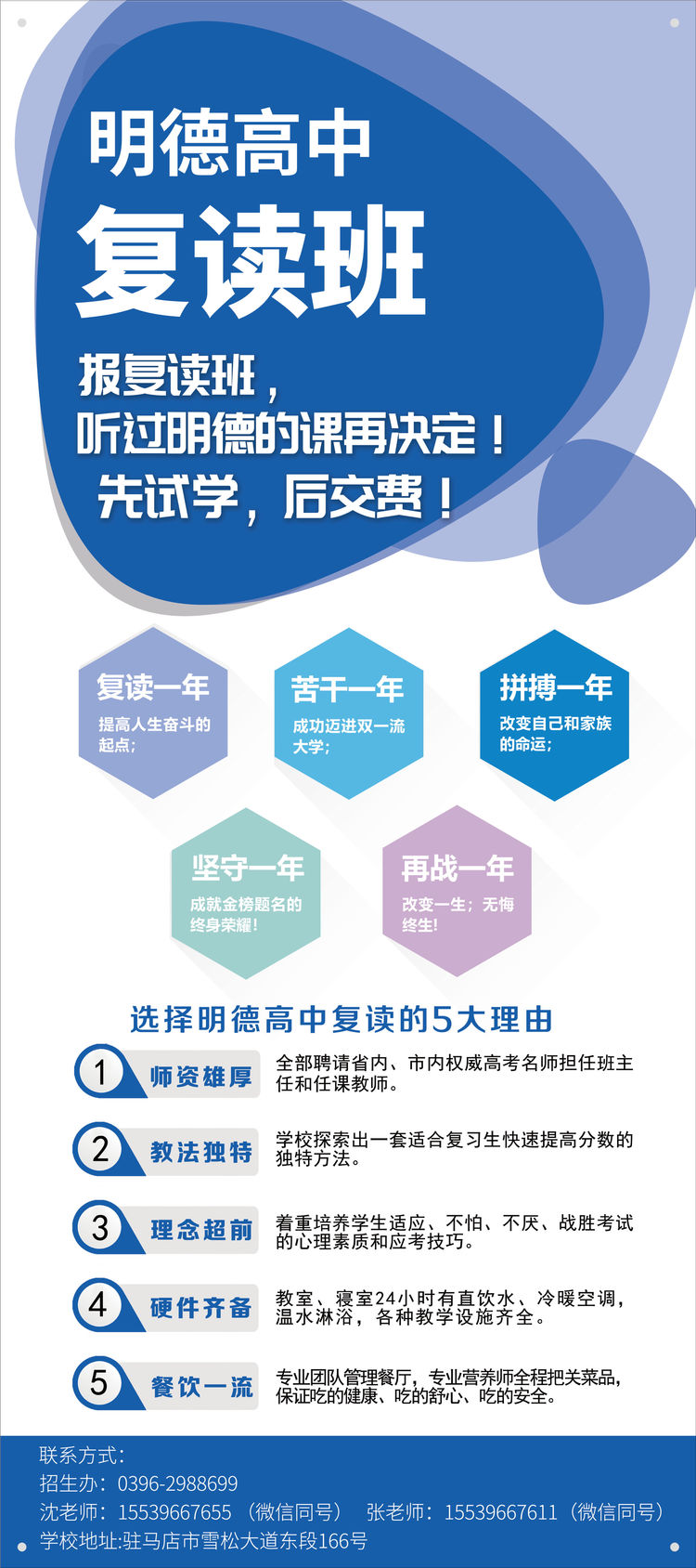 抉择未来,时不我待;携手明德,梦想起航。如果你在2022年高考留有遗憾,别灰心,驻马店明德高级中学愿与你携手同心、努力拼搏,帮助你快速提分,实现心中的名校梦想;如果中考结束后的你还未考虑好上一所怎样的高中,欢迎到明德高级中学进行了解和参观,明德有条件、有能力,也有底气让每一位青春学子都能通过努力获得长足的进步,成功考上理想的大学!(郭华宾 朱剑锋报道 通讯员 邓青 刘成汉)