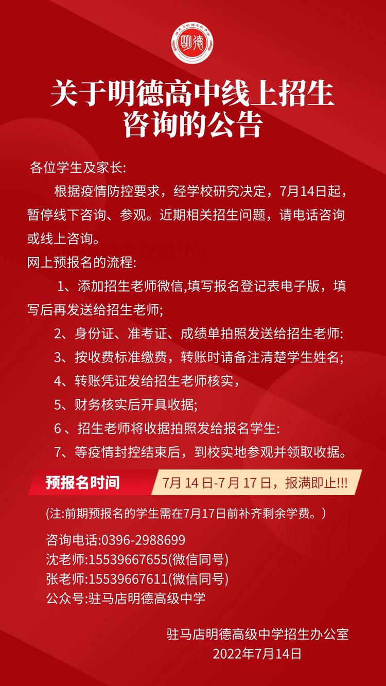 根据驻马店当前疫情防控形势,经学校研究决定,7月14日起,暂停线下咨询、招生。近期相关招生问题,家长或学生可电话咨询或线上咨询。预报名时间:7月14日-17日,报满即止。