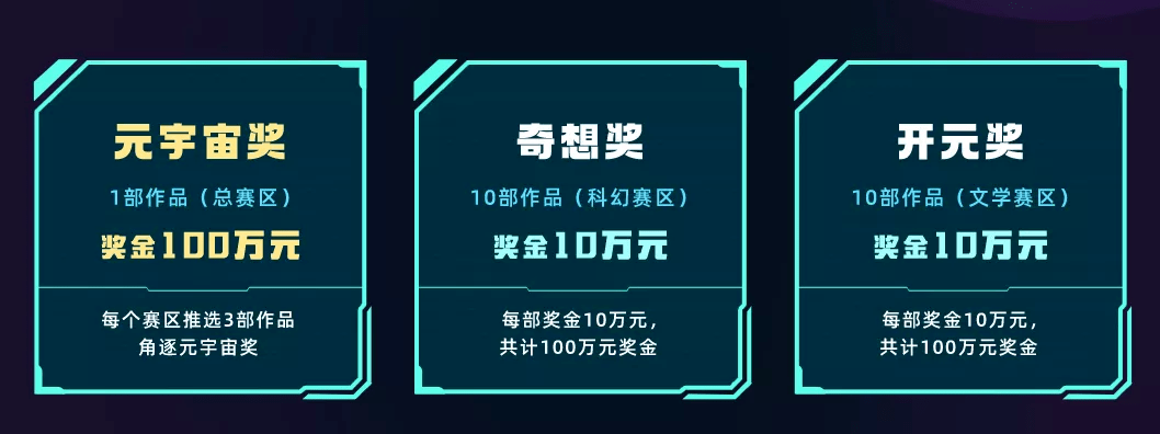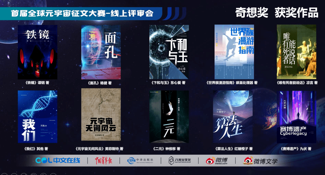 7月31日,中文在线的全球元宇宙大赛奇想奖(科幻小说类)揭晓,十部获奖作品从上万部参赛作品中胜出,每部获奖金10万元,共100万元,中国科幻的第一个百万大奖诞生(四届京东文学奖科幻奖1名,纯奖金20万元)。我隐隐约约地感觉到,“《三体》后时代”的中国科幻界,正在元宇宙题材上杀出一条血路,离突破性的作品出现的时间不远 了。