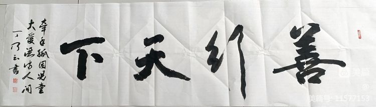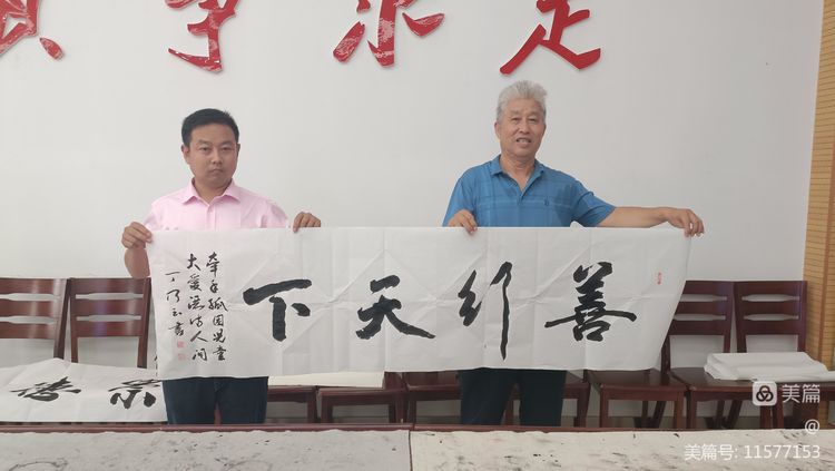在爱心洋溢的浓浓气氛中,李金孝会长及淄川区老年书画学会特聘咨询、淄川普照寺书画院常务副院长王林广、淄博市榜书协会会长、淄川普照寺书画院名誉院长王继军、淄川区老年书画学会常务副会长、淄川普照寺书画院副秘书长丁乃玉、淄川区老年书画学会副会长兼秘书长、淄川普照寺书画院秘书长刘元忠等现场挥毫泼墨,创作出以善意善举为主题的书法作品30多幅,赠予爱心志愿者。用以表达对志愿者的崇高敬意