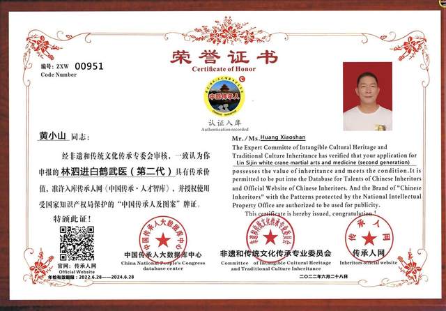 近日,来自福建省南安市、林泗进白鹤武医第二代传承人黄小山获得“中国传承人”荣誉称号。经中国传承人大数据库中心非遗和传统文化传承专业委员会审核,黄小山成功入库《中国传承·人才智库》,并授权使用受国家知识产权保护的“中国传承人及图”牌证。