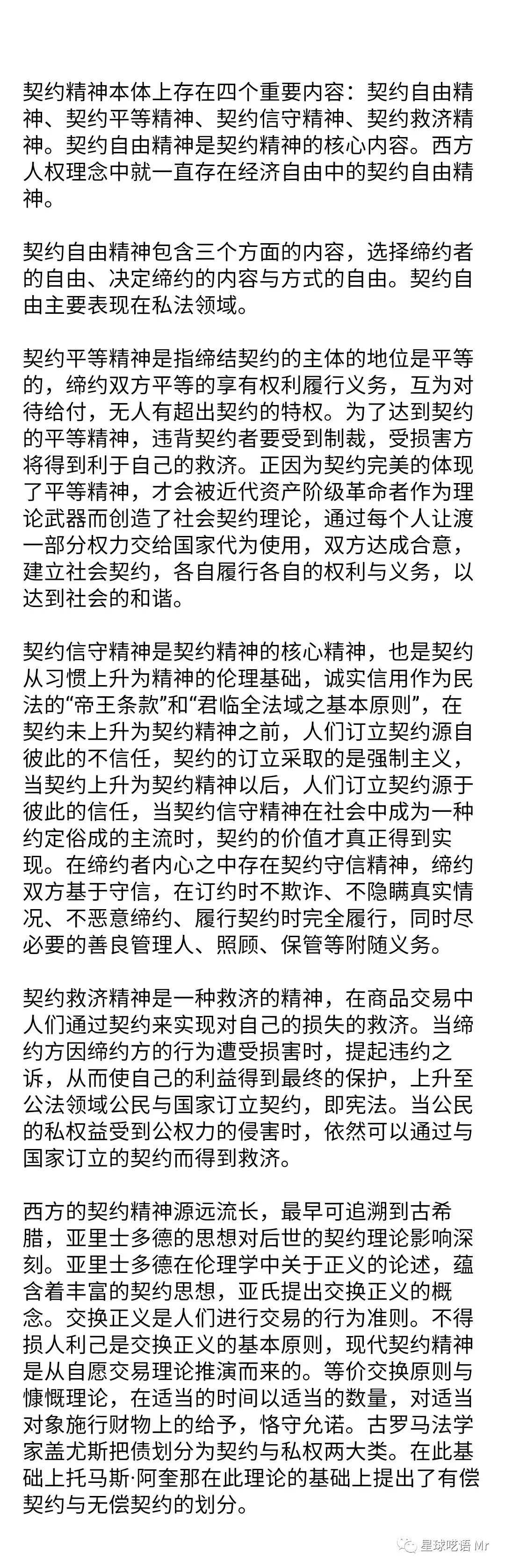 契约精神在市民社会已经从传统的私法领域发展到了公法领域,传统的私法领域的契约精神以合意为核心,面临着巨大的困境。1974年美国学者吉尔莫抛出了契约死亡的言论。日本学者内田贵以《契约的再生》来回应了这股浪潮,他认为死亡的是古典契约交易理论,契约没有死亡,而是在新的环境中得到重生。契约精神发生了一定变化。甚至出现了关系契约的说法。也就是将契约发展到社会人际关系中,横跨公法和私法的领域。