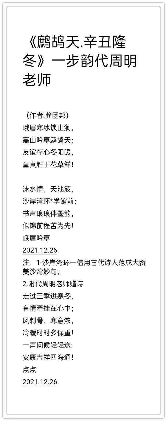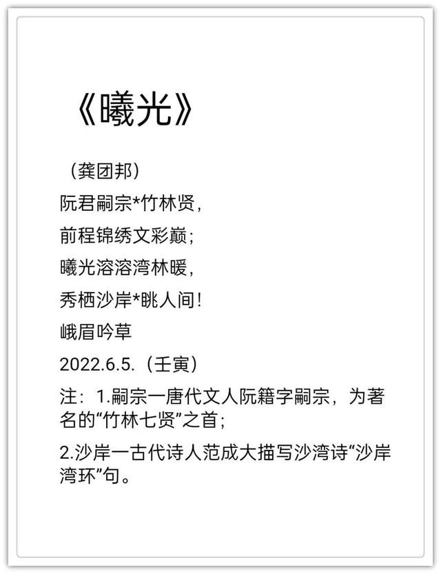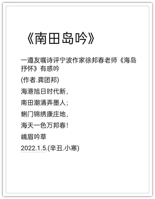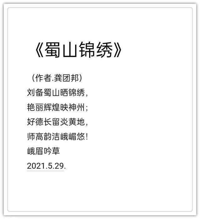 2020年作品入编中国楹联学会《联墨艺术宝鉴》(中国诗词楹 联出版社)。2020年古体诗词作品《虞美人.嘉山秋色》,《踏莎行.嘉山冬韵》, 《沁园春.嘉山情韵》被中国文联、中国作协、中国美协联合编篡的大型资料汇编《中国艺术榜样年鉴》所收录(目 前中国唯一一部综合体现国家文化力的大型文献一编者。2021年作品入编一带一路专刊《中外艺术》一龚团邦(国际刊号:Issn2710-4907),被一-带- 路旅游促进会骋为终身顾问(骋书编号: 20210314) ;