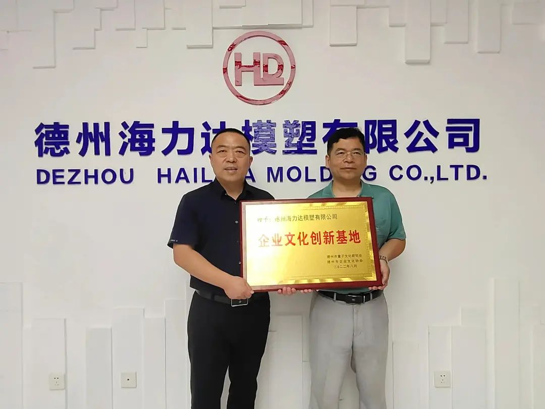 授牌仪式在海力达模塑有限公司党员活动室举行,董子文化研究会执行主席麻然松向德州海力达模塑有限公司董事长申海增颁发“企业文化创新基地”牌匾。