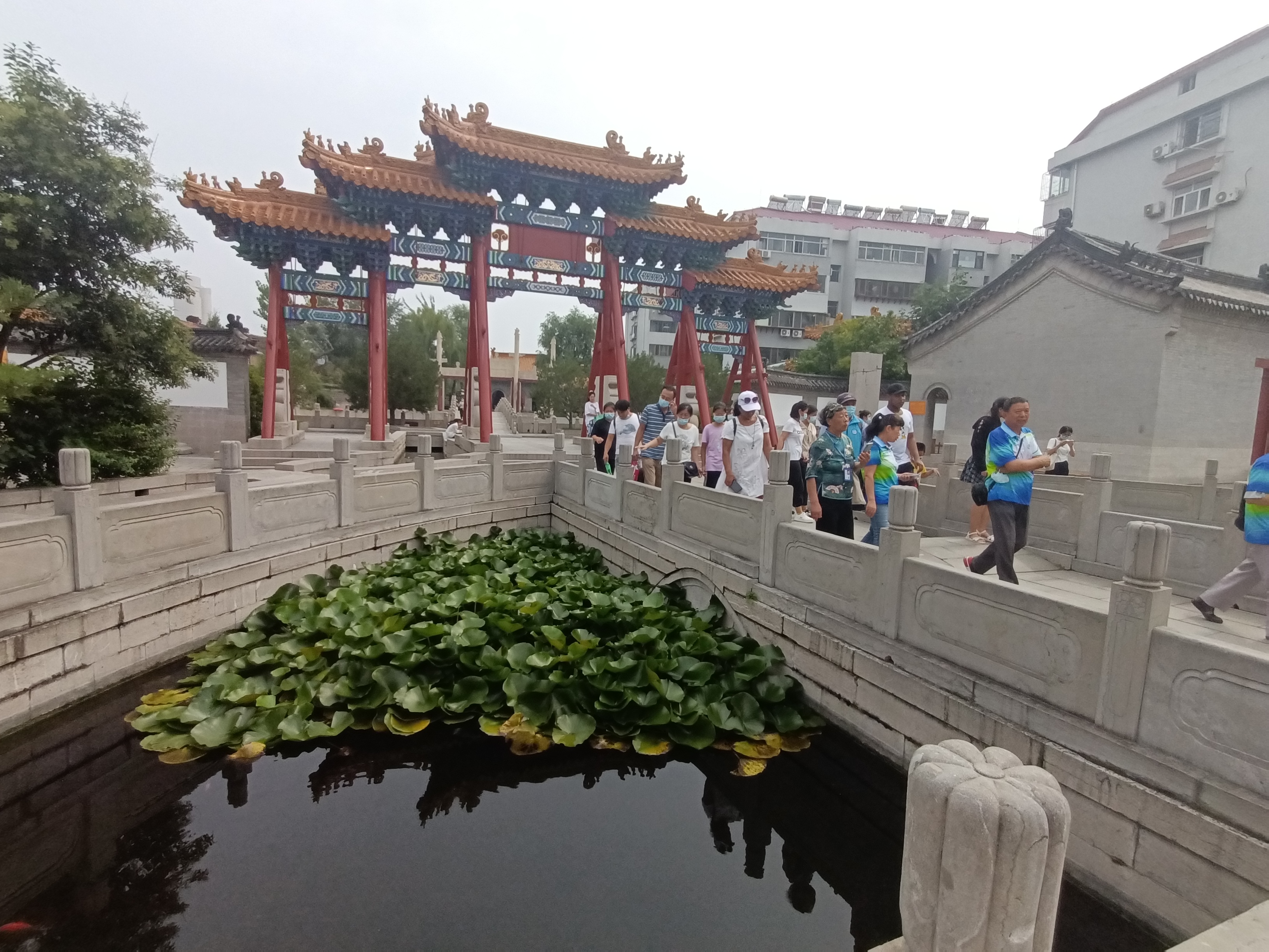 迎面是泮(pàn)池。泮池,又称"泮宫",依古礼,天子太学中央有一座学宫,称为"辟雍"[pì yōng],四周环水。汉代班固《白虎通·辟雍》:“天子立辟雍何?所以行礼乐宣德化也。辟者,璧也,象璧圆,又以法天,於雍水侧,象教化流行也。” 而诸侯之学只能南面泮水,半天子之学,故称"泮宫",是官学的标志。又因孔子曾受封为文宣王,所以各地孔庙皆有"泮池"学宫。泮池上有一座五孔拱桥,称泮桥。科举考试时,学子过桥去拜孔子,称为"入泮"。文庙泮桥,按照科举礼制,只有状元才能从泮桥上进入庙中,因此也称“状元桥”,在当年,我等凡人皆不得行于此桥的。