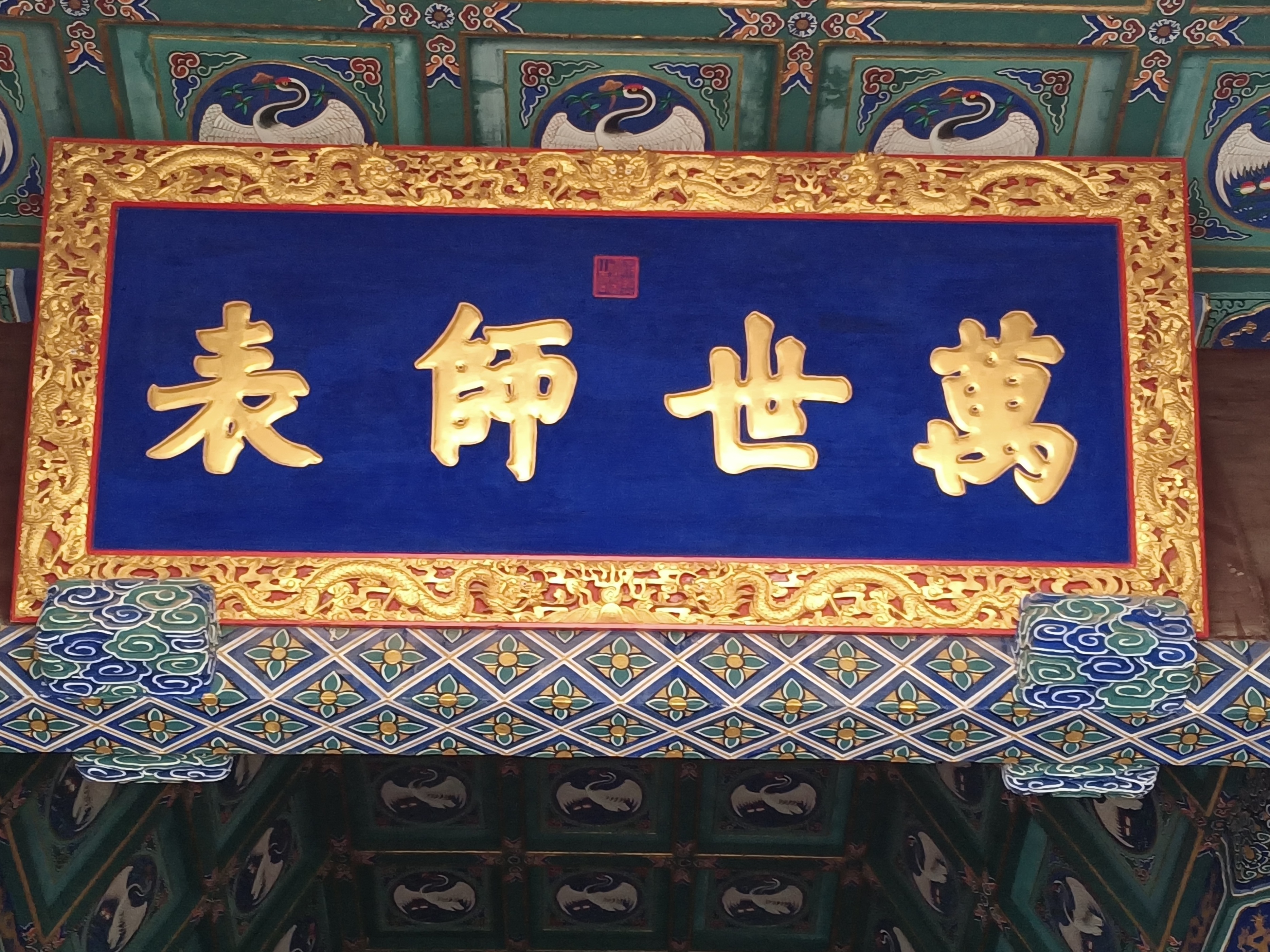 大成殿正中供奉大成至圣孔子塑像,顶部悬挂清帝题写蓝底金字匾额“万世师表”,两侧供奉的是颜子、曾子、子思、孟子“四配”塑像,还陈列有祭孔礼乐器。大成殿两侧东西廊庑内各有孔子弟子牌位塑像34尊共68尊,加上大殿内4配,孔门72贤全在此了。我们在文宣王塑像前虔诚拜谒了先师孔子。