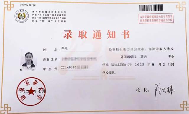 张甘泉之女张铭以优异成绩被南京农业大学录取