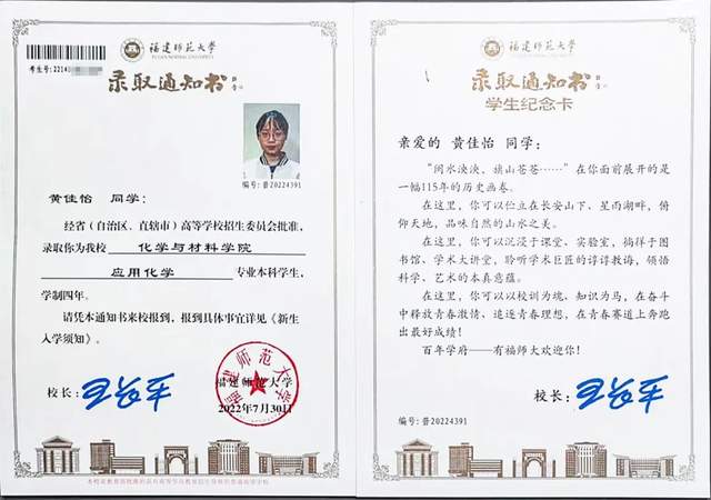 黄建溪之女黄佳怡以优异成绩被福建师范大学录取