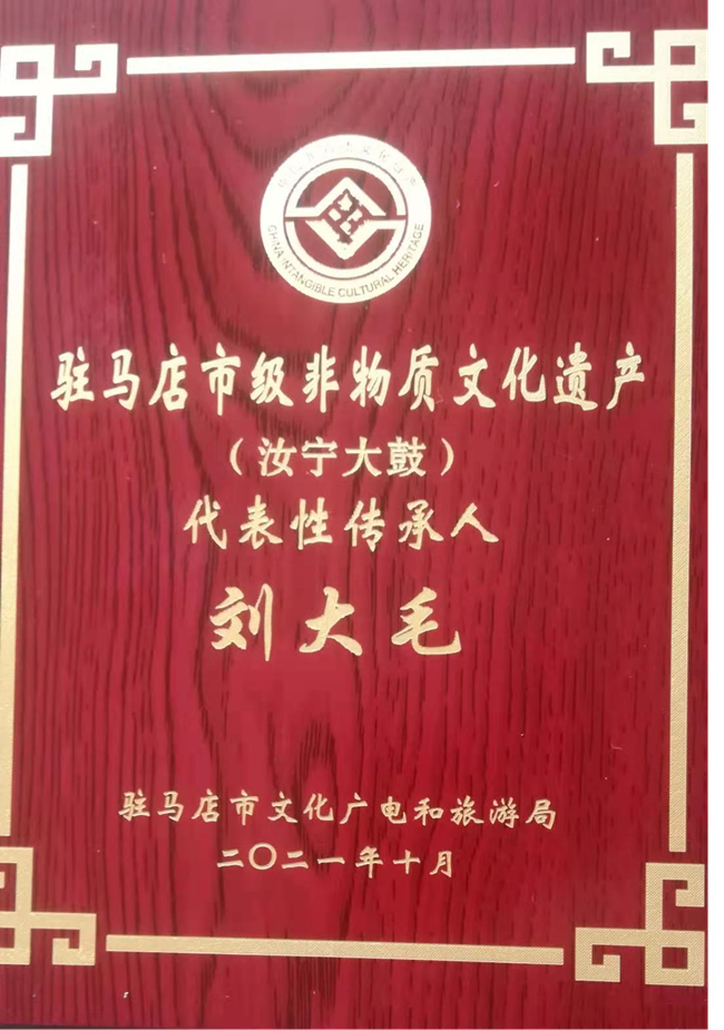 2018年2月,“汝宁大鼓”被驻马店市人民政府公布为第五批驻马店市非物质文化遗产代表性项目,在天中大地乃至中原文化史上留下了永远的印迹。2021年10月,刘大毛先生被驻马店市文广旅局批准为市级“非遗”(汝宁大鼓)代表性传承人,也是市级“非遗”项目汝宁大鼓第六代传承人。