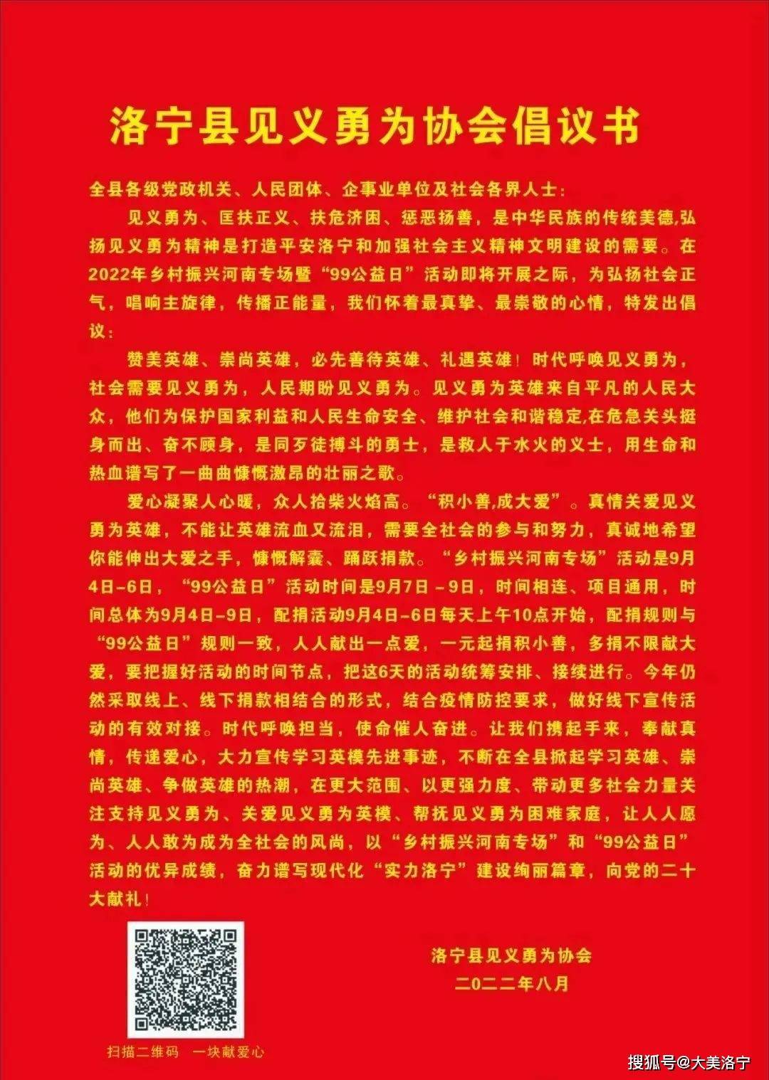见义勇为、匡扶正义、扶危济困、惩恶扬善,是中华民族的传统美德,弘扬见义勇为精神是打造平安洛宁和加强社会主义精神文明建设的需要。在2022年乡村振兴河南专场暨“99公益日”活动即将开展之际,为弘扬社会正气,唱响主旋律,传播正能量,我们怀着最真挚、最崇敬的心情,特发出倡议: