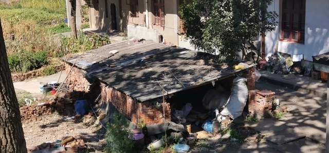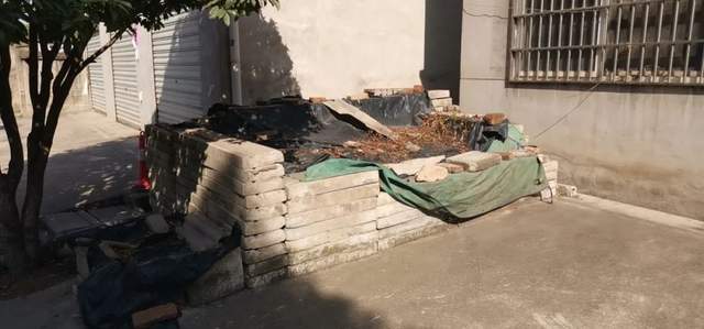 整改前(房屋门口杂物乱堆乱放,花坛未修整)
