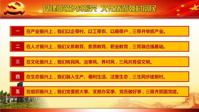 三是以“三色”文化影响教育村民:先后推出了以体验农耕文明、民俗特色为主的“金”色文化;以传承革命精神、先烈遗志为主的“红”色文化;以牢记传统美德、历史根脉的“古”色文化。通过这些文化渗透与传播,不仅让村民始终牢记先辈勤劳俭朴、敬业持家的光荣传统,也使之成为振兴人永远向前的精神基因。