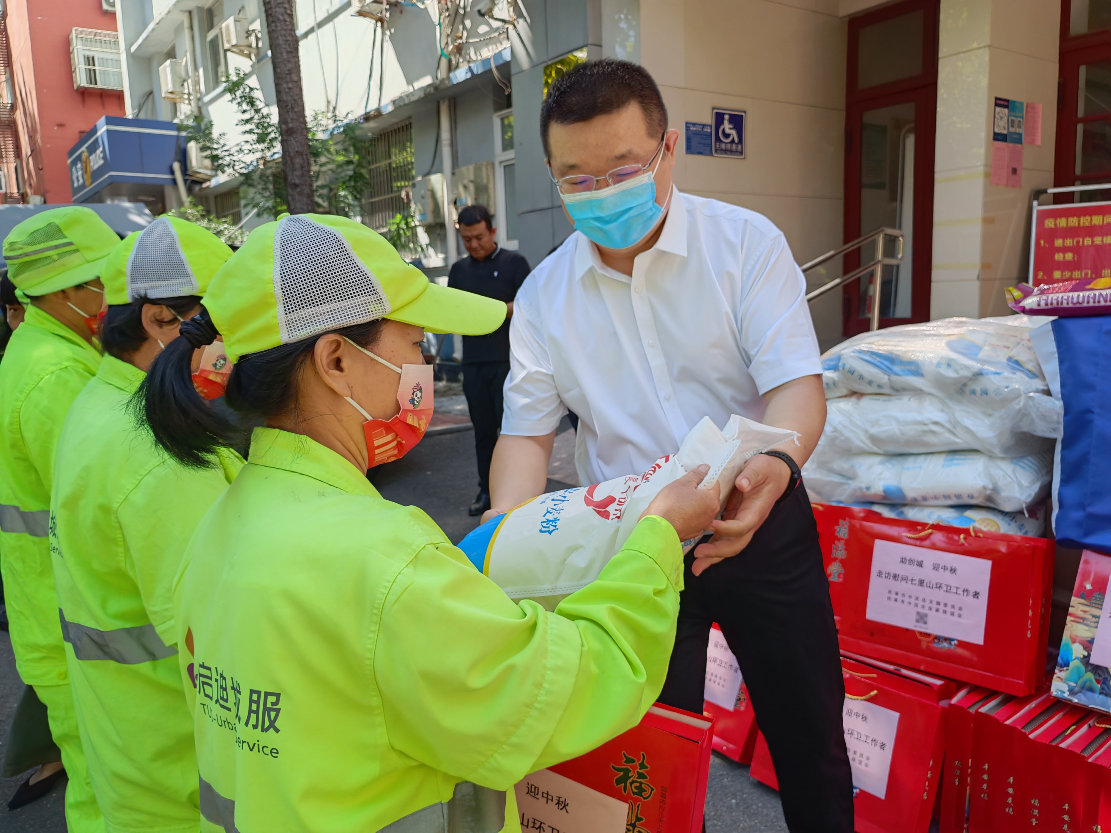在中秋佳节来临之际,为表达对奋战在创城一线的环卫工人的关怀和祝福,9月3日上午七里山办事处联合民革市中区总支部委员会、民革市中区企业家联谊会组织开展“助创城 迎中秋”走访慰问环卫工作者活动。