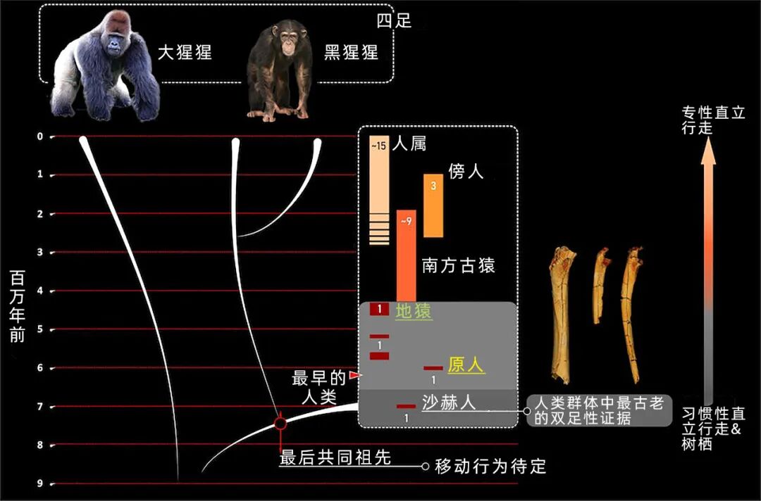 由于非洲和欧亚大陆在中新世末期(晚于1000万年前)的古人类化石记录多样性很低,目前,唯一有据可循的假说仍然是,非洲大陆上的人类分支获得了直立行走的能力。