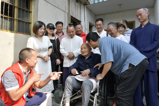 新昌县工商联(总商会)、舍得读书会的志愿者从嵊州出发后,分赴新昌县儒岙镇王渡里村慰问101岁的梁启源老兵。同去的新昌县公安局的民警代表,也向梁启源老兵赠送 了中秋月饼。在新昌县华泰养老院,志愿者的身影来到100岁的石全法老兵的房间,对他进行慰问,送上亲切的关爱。