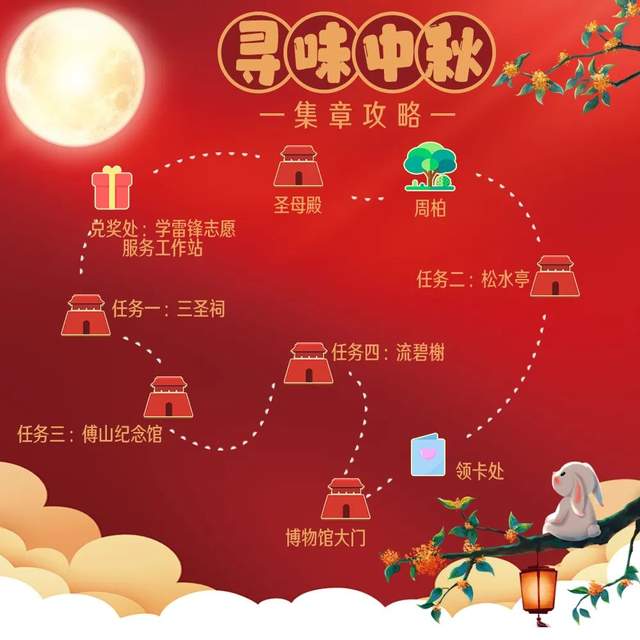 在晋祠博物馆馆区内参与集印章活动,集齐晋祠大门、圣母殿、周柏、铁人、歌舞侍女五枚印章,即可兑换晋祠博物馆为您精心准备的文创商品一份,并参与录制中秋节祝福视频。