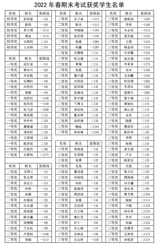 2022年春季期末考试优胜学生