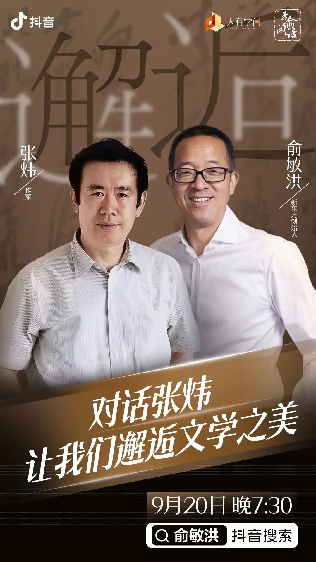 抖音搜索“俞敏洪”直播间——大家一起来与张炜对话吧!