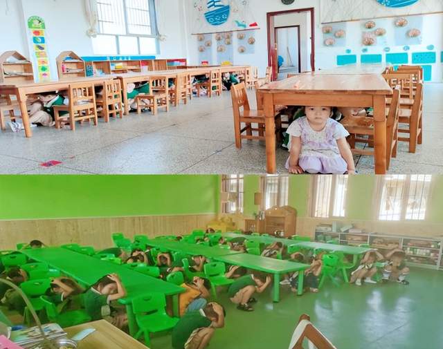 当听到第一声警报声响起,在教室里进行日常活动的幼儿立刻跟随着老师的指挥,迅速做出反应,低头弯腰、双手护头、蹲在桌下安全位置就地避震!第二遍警报声响起,幼儿在各班老师的指挥下,双手护头一个跟着一个有秩序地疏散到操场上。2分25秒,全体幼儿及老师安全撤离教室来到操场中心,整个演练过程快速、安全、有序。