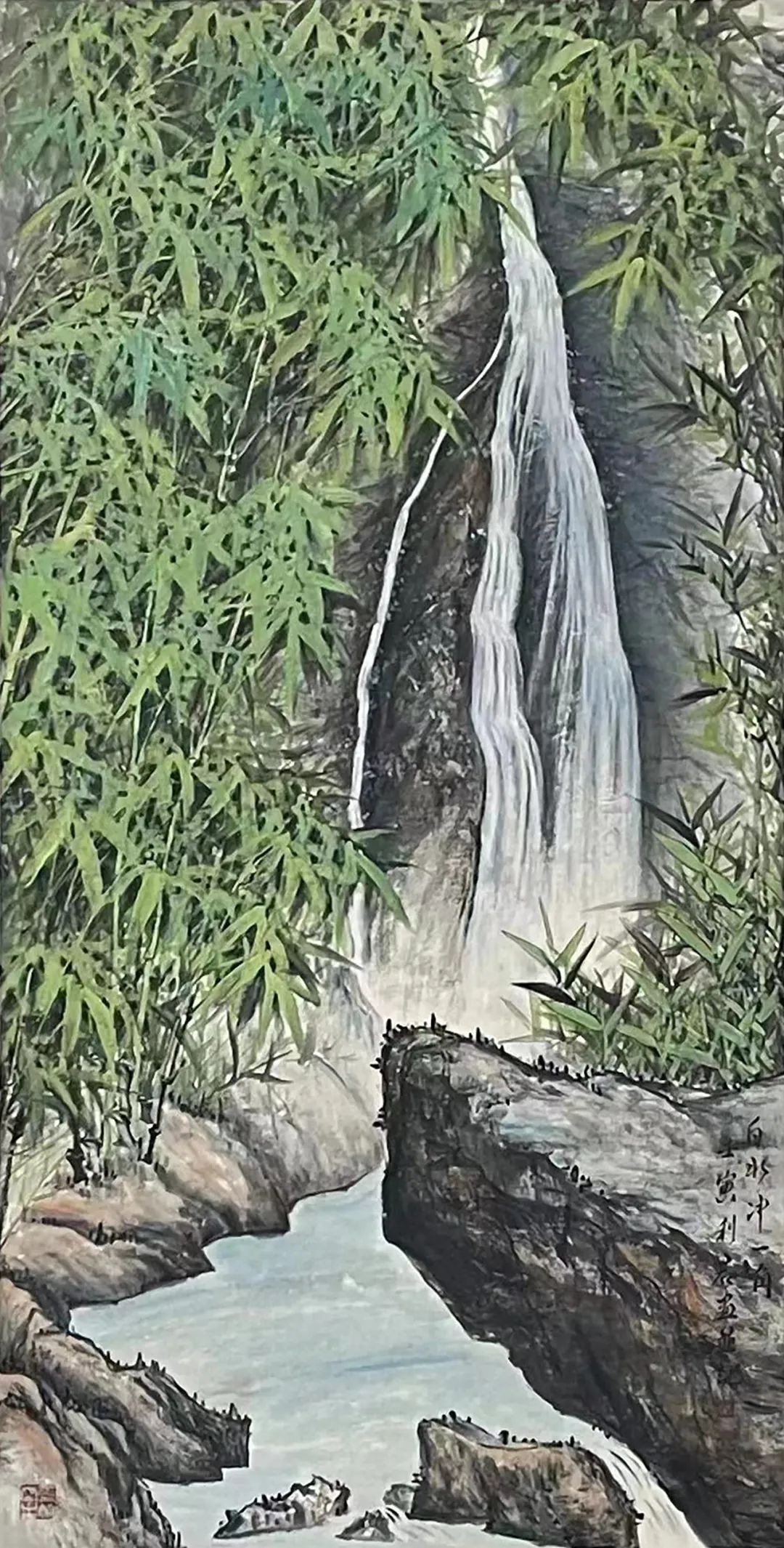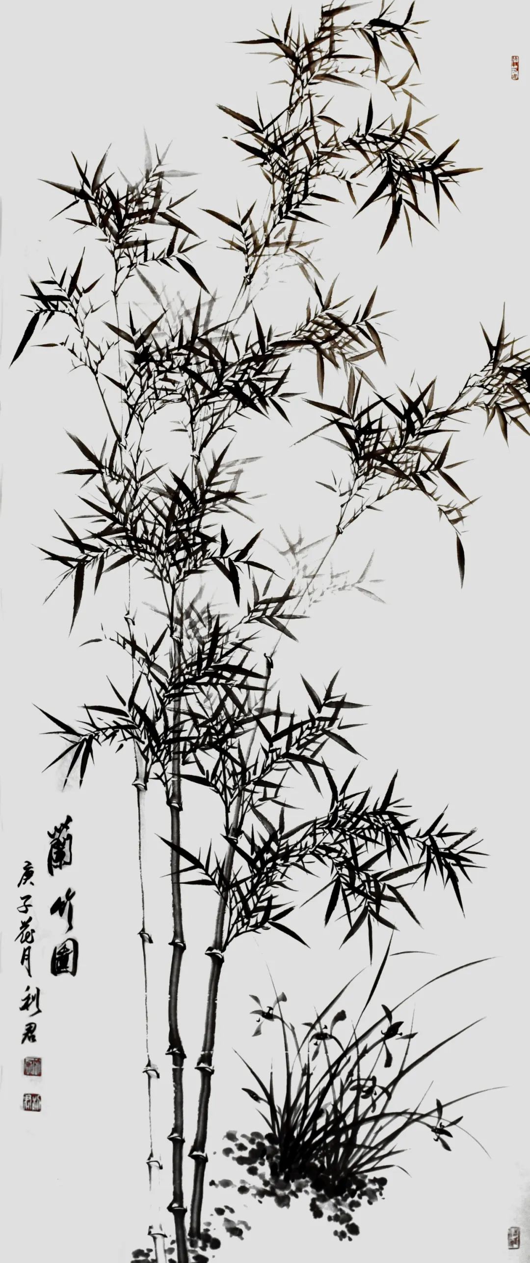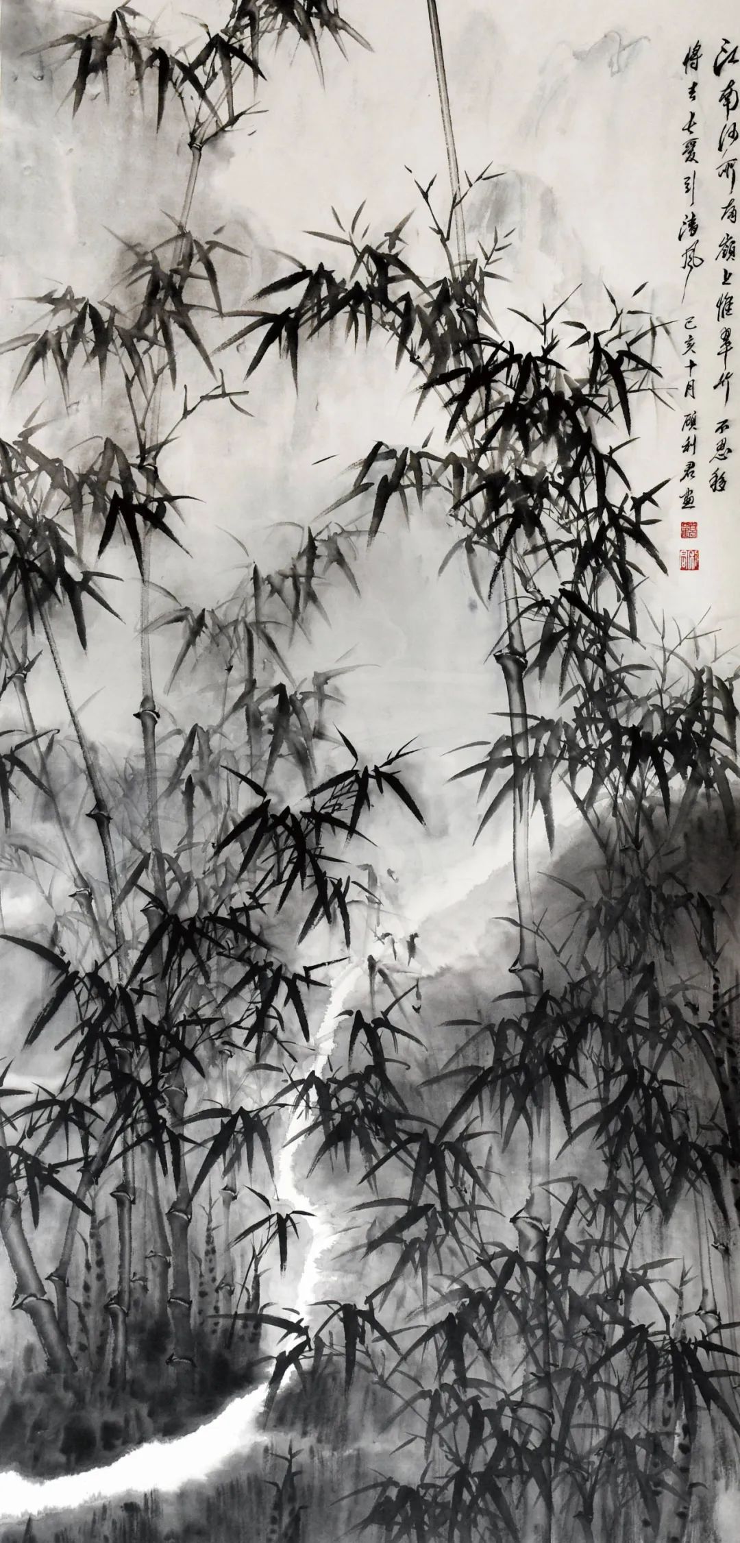 笔墨儒雅弄竹影,干皴湿染写华韶。谢赫论画有六法,首论气韵生动。先生画竹以气韵为核心,以品味为风神,观其作品如竹置眼前,非神笔不能画得如此生动。他的竹画意象极为广博,除了有文人画的萧萧之韵,也有仗剑走天涯的侠者风。我自立天地,节气君子品!先生专攻竹题,一题博天下,江南一竹名副其实,画竹也可以功盈天下!