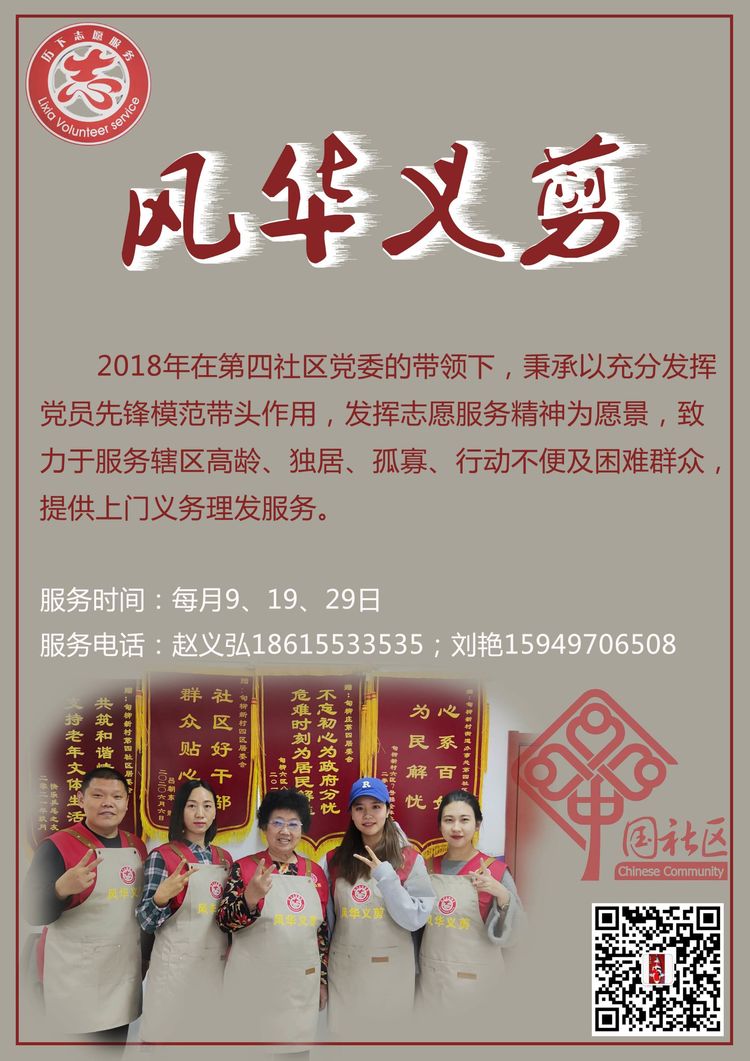 “风华义剪”项目,面对新局面、新环境、新机遇,我们不忘初心,坚定信念,要紧跟时代的发展步伐,全力开创“全心全意为人民服务”+“社区综合治理”新局面,为美好而灿烂的明天而努力。
