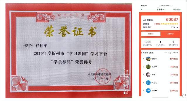 国家推出“学习强国”平台后,任老师如入宝山,每天坚持听读、评论、答题、对战,目前总积分60087分,全国排名3621270名,2021年中共忻州市委宣传部授予其“学员标兵”荣誉称号。其学习行为产生了强烈的示范作用和突出的引领作用,一届又一届的学生家长都成为她的强国之友。她和同事们分享:学习强国是提升班主任意识形态领域觉悟的最佳平台,是教师的百科文库,是工作生活的良师益友。
