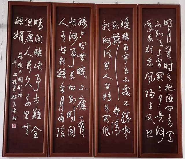 邹高德老师不仅篆隶楷行草五体皆善,而且富于创新精神。他研制出代替墨汁的书法膏料,凝而不滞,流而不散,在板材上写出美不胜收的各种立体书法。