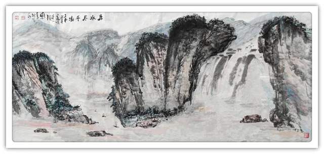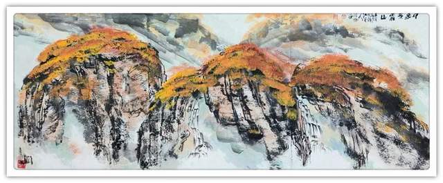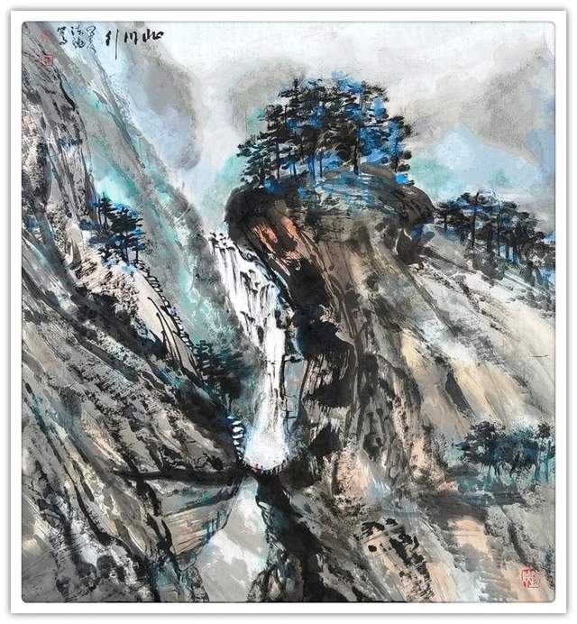 虚实相生妙,文气盈盈足。他的山水作品以浑厚华滋为写意价值,突出表现笔墨色彩的表现力,落笔钧直,铺陈痛快,水墨苍而秀,以苍显骨,以秀显韵,气韵生动便盈其中,浓墨重彩浑然大气,这正是师于造化而成的云上山巅!客路青山外,云山更高下,如诗却是一幅画!书画两能,书法修碑帖,丹青师造化,文人格局,古今永传!