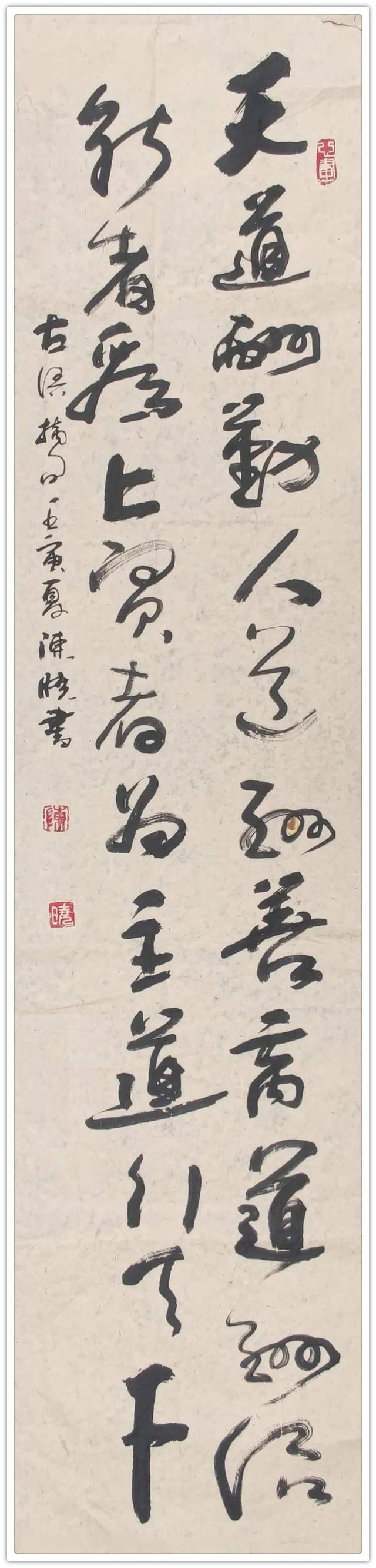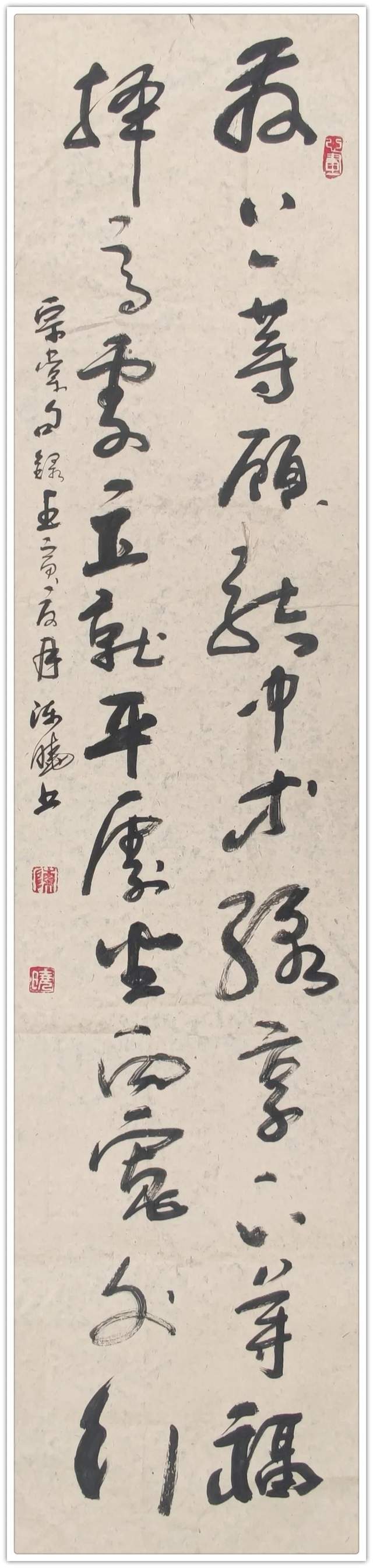 他的书法贵为得法。在求得上法的过程中,对书法文化的源与流都进行了一一探究,远写金石甲骨,再写汉隶十碑,把秦风汉韵参意的相当透彻。最后以草书为恣意,成为依书抒情的翰墨能家。他的草书,习成章草法度为主,然后介入一些今草和狂草的元素,非常重视线条的塑造力。通过对十七帖、伯远帖、中秋帖等晋韵法帖的心追手临,解锁了书法既是天质自然放手写心的真谛,一点之内殊衄挫于毫芒,一划之间变起伏于锋梢。其书法妙在一个“变”字,线条的长短有变,结体的平险有变,墨韵的浓淡有变,并且变化多端,令人琢磨不定,又情理之中。