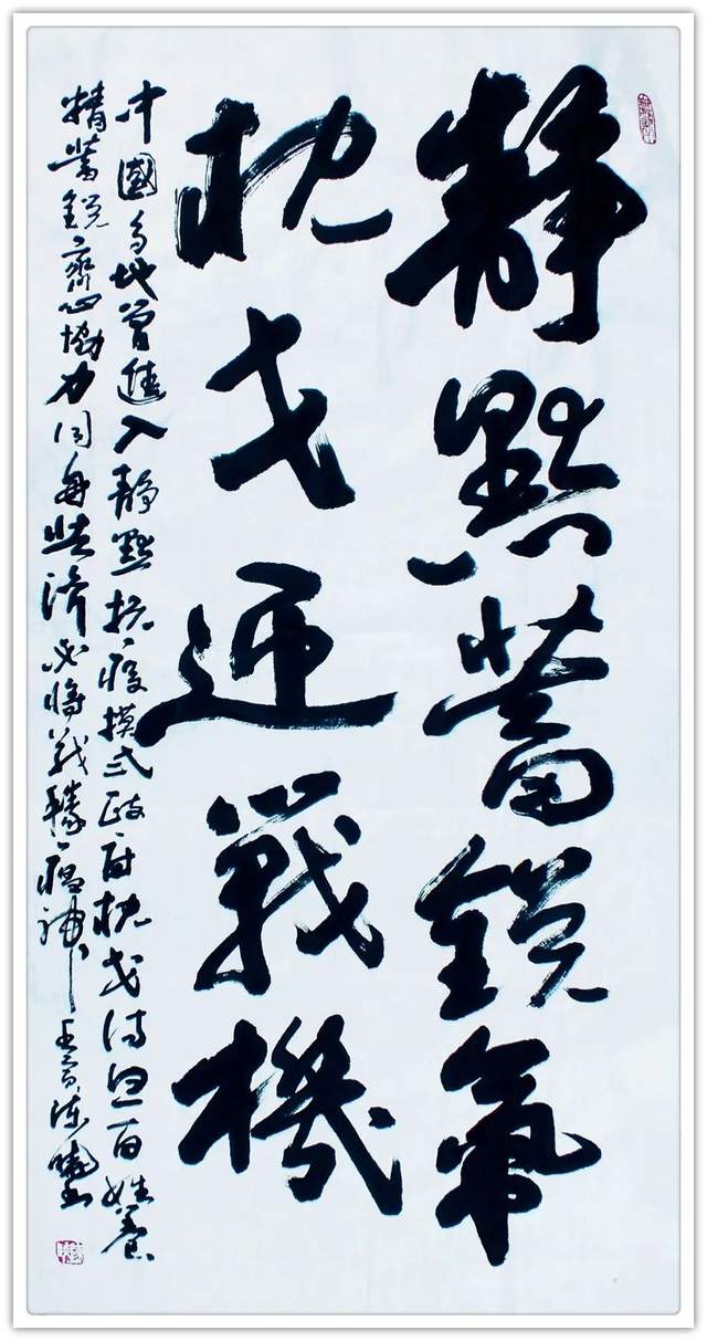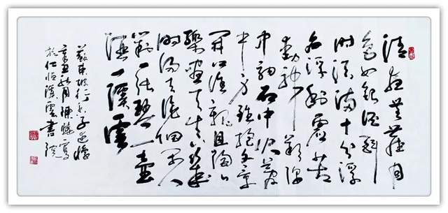 书法因变而灵,审美因变而神。所以观赏他的书法总是有虬龙蜿蜒谓其劲,鸾凤徘徊谓其勇的姿态要妙。细的线条如清泉石上流,牵丝映带,落花飞雪。粗的线条如鸿飞兽骇,绝岸颓峰,飘风骤雨。笔墨运行的时候,对于速度与力度的掌握娴熟于心,快写时小豁胸中气,长壁纵横千万字,满座失声看不及。慢时如中流击楫,激楚浪以成纹,茫涩蔓妙。再调以或轻盈如飞或力透纸背的力度与速度相依相成,书法的观感就有了势来不可止,势去不可遏的飞空妙密!翰墨以变化为神,先生贵得此神法,当然写神通!