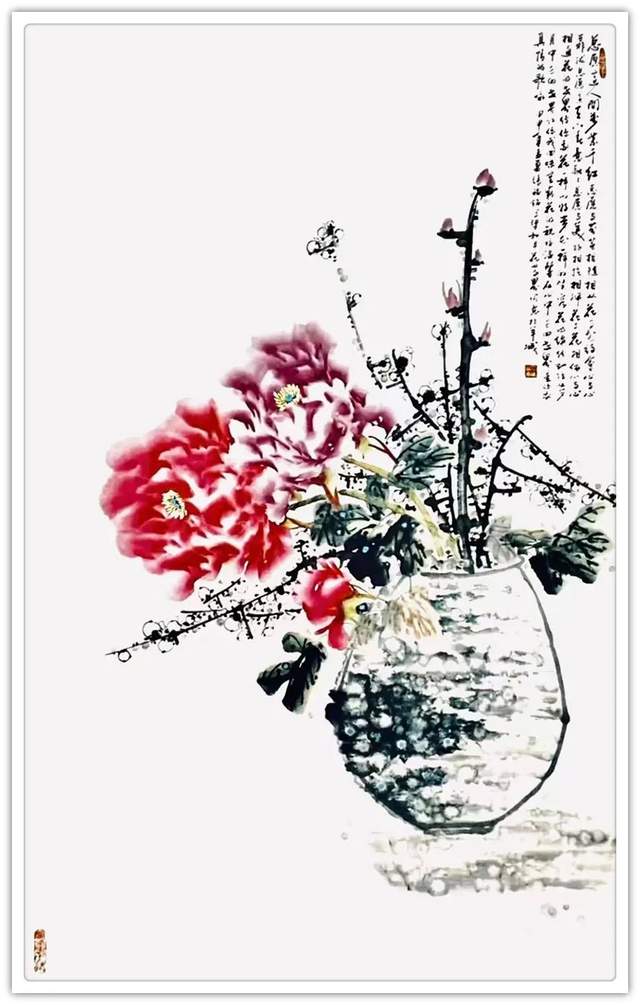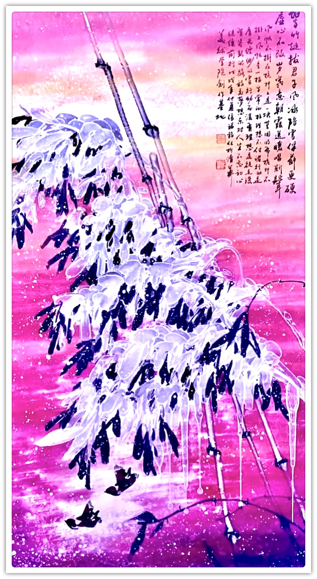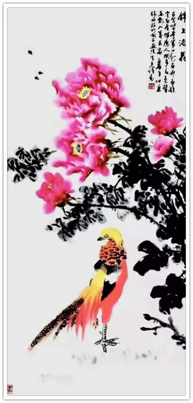深师法帖,妙作气韵。因为书法功夫炉火纯青,所以他的丹青创作就有文人画以书入画的加持。骨法用笔,应物象形,随类赋彩,气韵生动。锦鸡牡丹寓富贵,竹凌冰雪清虚风,龙梅与雪争春,紫藤云天化生!他用娴熟的笔墨功夫和丰富的色彩渲染,把花鸟作品创作得艳雅脱俗,有很强的可读性。品之又品,赏心悦目。再加上画如其人的修养作支撑,让他的丹青作品可以拥有笔墨当随时代的建树。凡属大家,尽皆如是!书画贤家,一览无余!