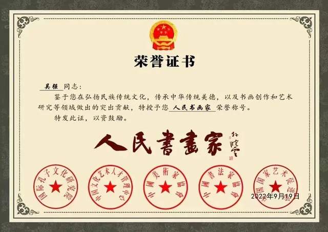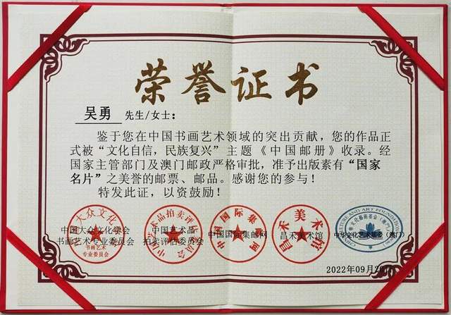 对于吴氏兄弟,从艺六十载,已过耳顺,将至古稀,幼时的爱好已成大业,功绩斐然,岁到成熟季,亦为收获月,可谓喜庆多。九月十九日,清华美院的弟弟吴强,被官方授予“人民书画家”荣誉称号!九月二十日,就职于西北工业大学的哥哥吴勇,被中国大众文化学会,书画艺术专业委员会推举为“新时代杰出文艺工作者、当代艺术名家”!并由国家邮政总局将其27幅新近作品,作为“国家名片”,出版《珍藏邮册》,面向全国发行。