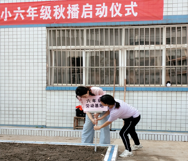 栽种任务完成,蔡主任庄重地在属于六年级的劳动基地插上了“六年级劳动基地”牌子。