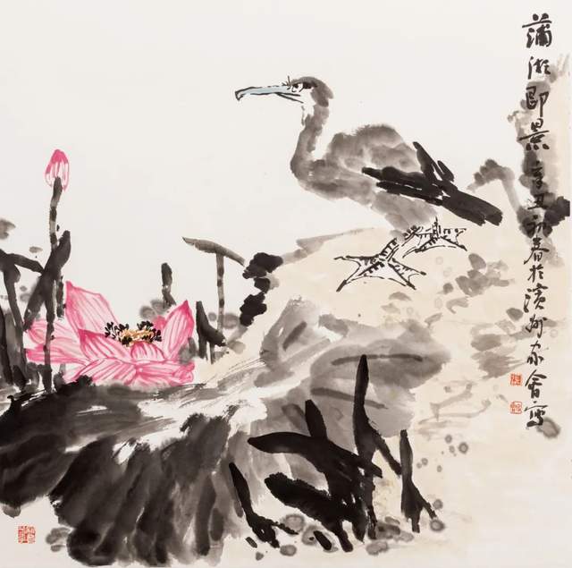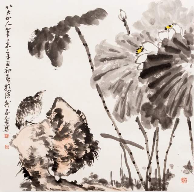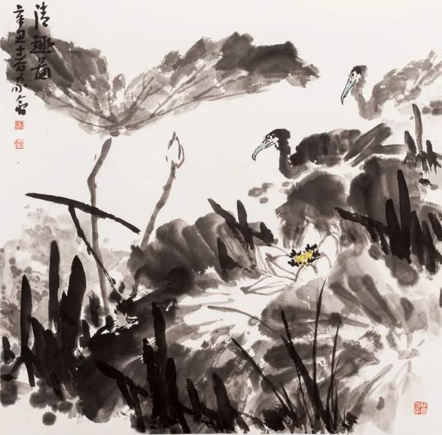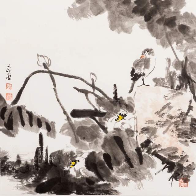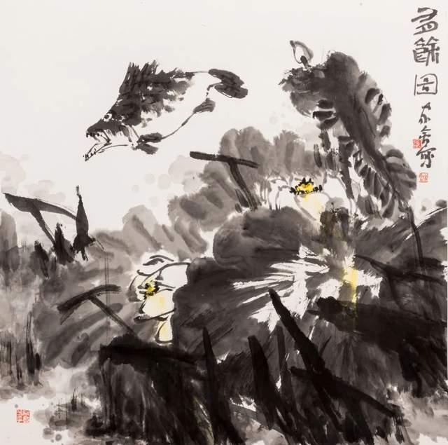 张家会的荷花,多见秋荷、残荷。他笔墨洒脱,浓淡相宜,繁杂中蕴含章法,墨色里饱含韵律。所画残荷,枯枝清奇,败叶曼妙,错落有致,一种凄寂之美,阐释出文人清高淡雅;秋荷,落墨淡然,如云似雾,叶片交合,繁复中蕴含空灵,水墨交织间尽显清秋之美。荷间,往往有几只水鸟,或引颈高歌、或俯首觅食、或信游水面,寥寥数笔,姿态各异,使画面顿生灵动之感,为荷的禅意,注入了文人孤高、典雅、纯洁的情致。