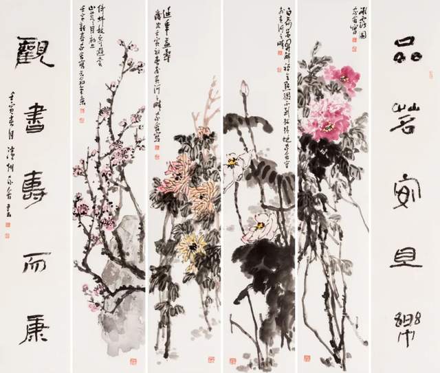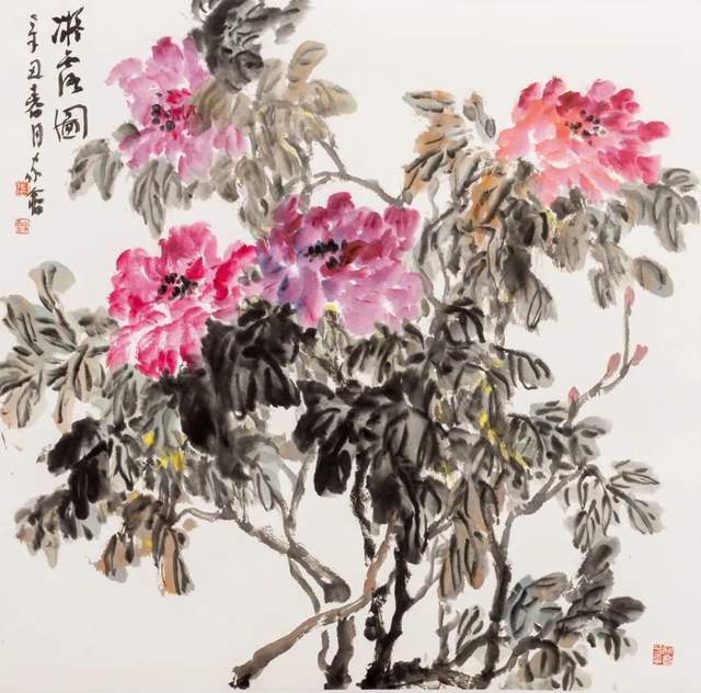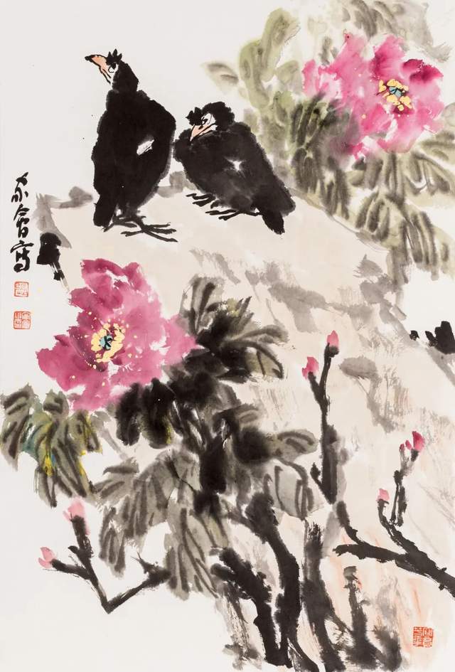 其画作,以线条见长,晕染有度,留白得法,画面清丽疏朗,典雅脱俗。他所画的牡丹,或肥美丰腴,富态高雅,尽显国色天香华贵;或去肥取瘦,枝显清雅,叶现筋脉,一枝一叶尽得精要,他将牡丹肥硕花朵,去繁复,取要旨,有时以丝丝缕缕线条勾勒,突显神韵,表现出独特的构思与抽象能力。