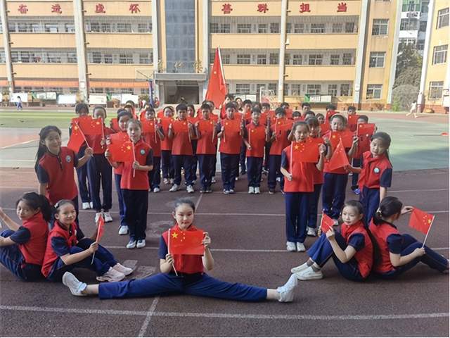 同学们挥舞着红旗,昂首阔步地走在操场上,随着乐曲的旋律歌唱《我和我的祖国》,那雄壮的歌声响彻了整个校园,呈现出校园一道靓丽的风景。