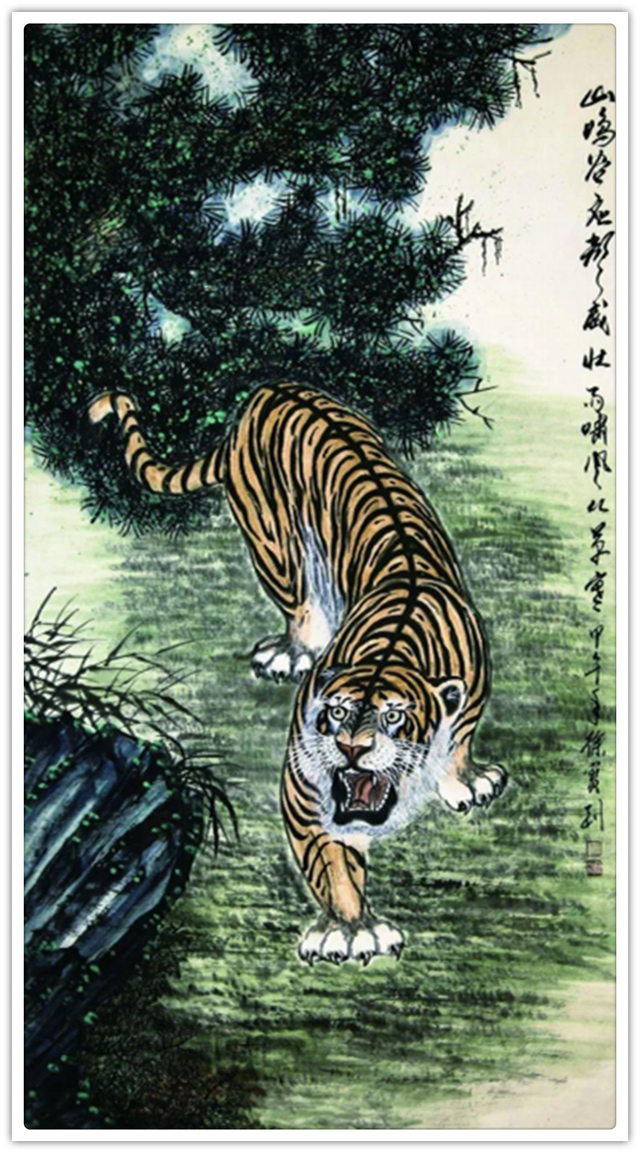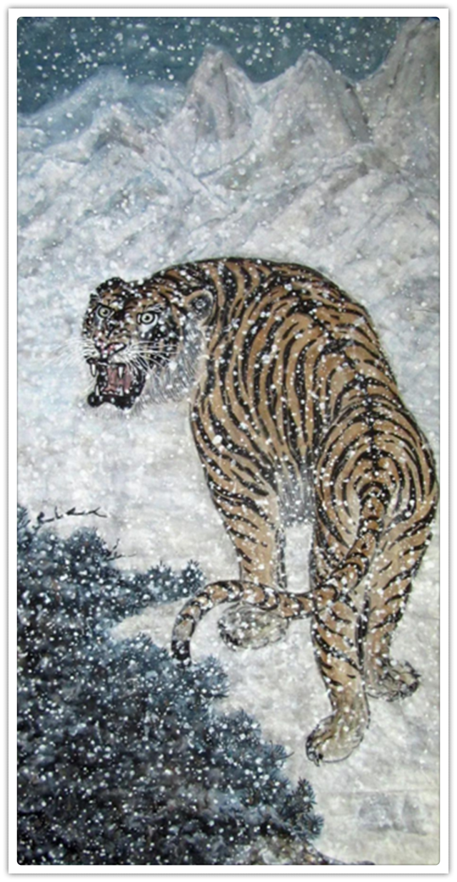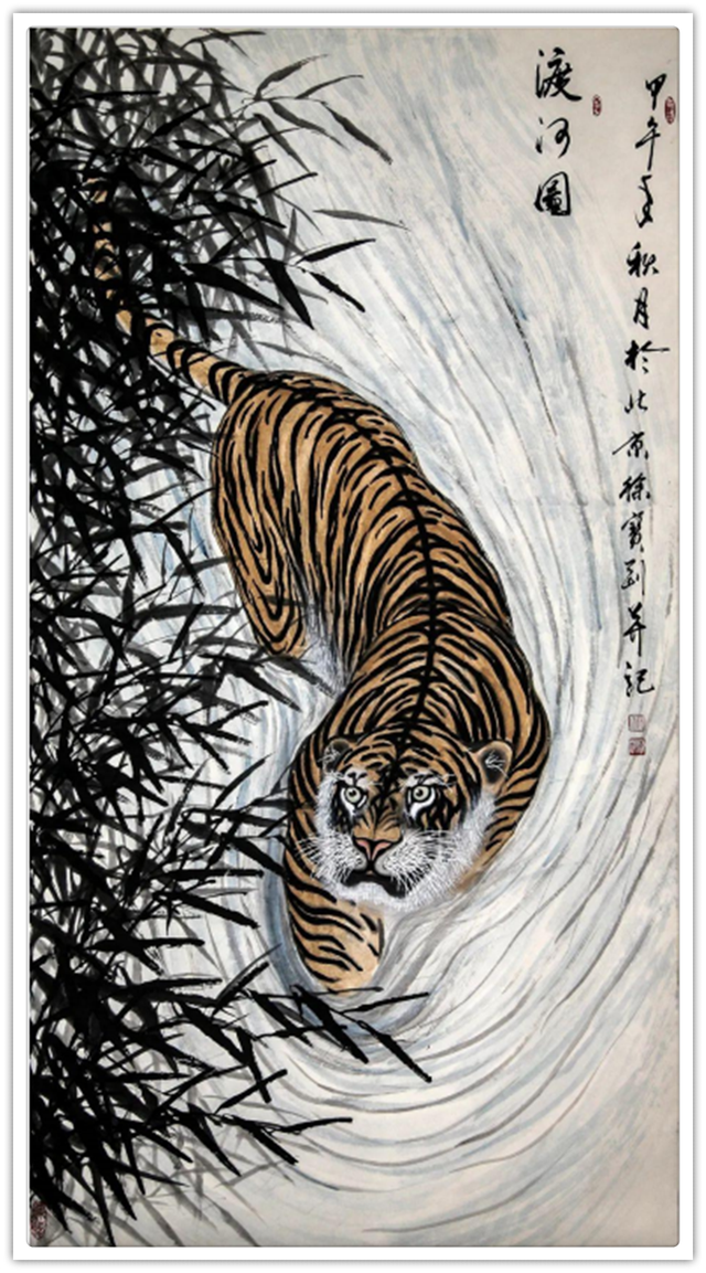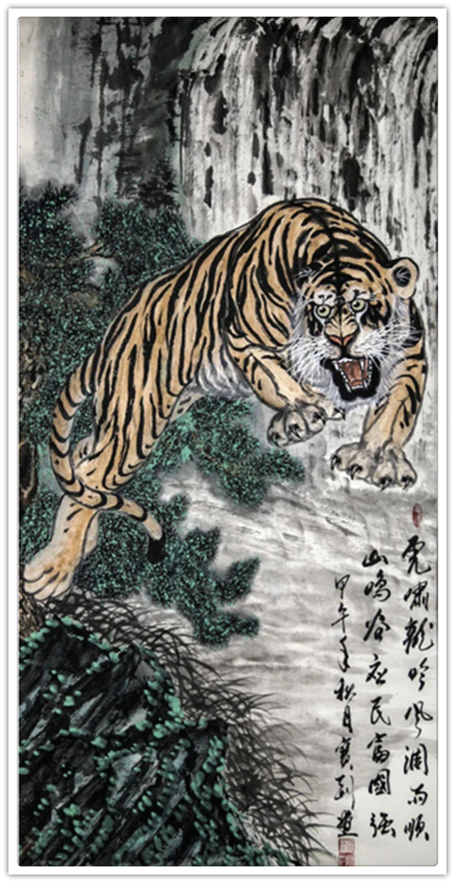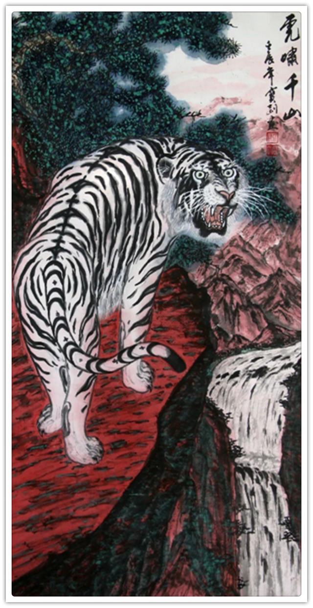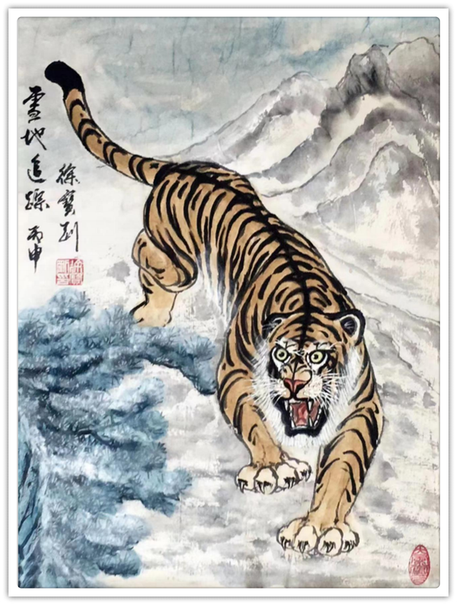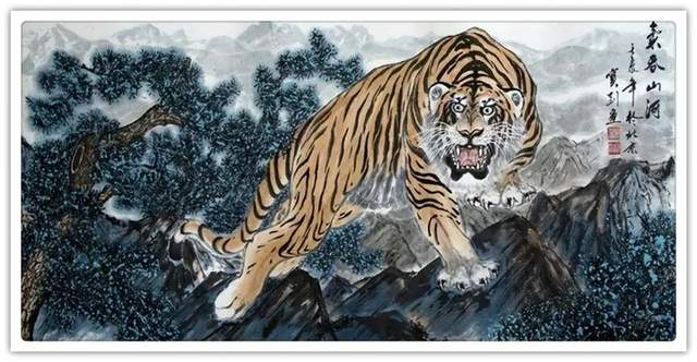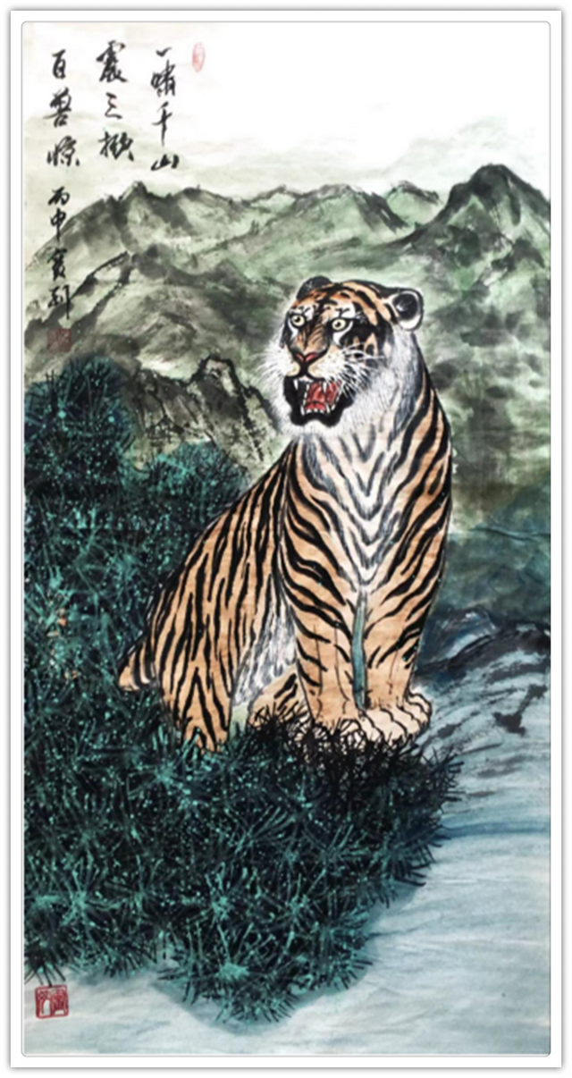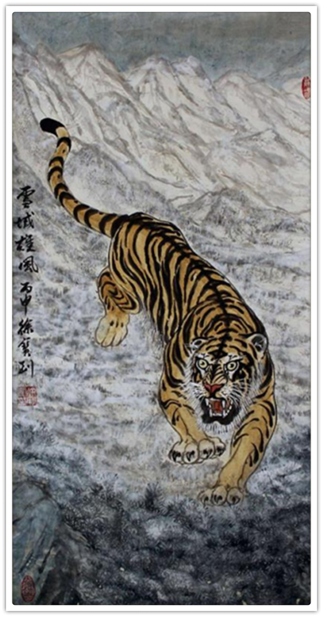 他的绘画题材相当广泛,山水、老虎、竹梅画得遂心应手,很有古典气韵,也有笔墨当随时代的建树。画老虎以纹谋骨,画得骨力雄强,可见啸天之威!动态与势态同时都有精彩的表现,这是他的老虎远观看有跳天门之威,近看有卧凤阙之神的重要原因。小写意可以笔笔相生,夺老虎之精神,也可以笔笔相映掠老虎之体貌,正是雅俗共赏的真功夫。如果老虎只作雅,难免画得风花雪月失了气势。如果老虎尽为悦目,难免画得会有烟火气。尽俗非妙,只雅非圣。徐宝刚最能拿捏住形态虎与神态虎的创作点位,所以起笔落笔可以举重若轻,把老虎画得形神兼备。特别是他又有极好的山水创作能力,虎以山作烘托,立骨传神,更显精气神。上山为王者,下山为勇者,文化内涵一目了然。