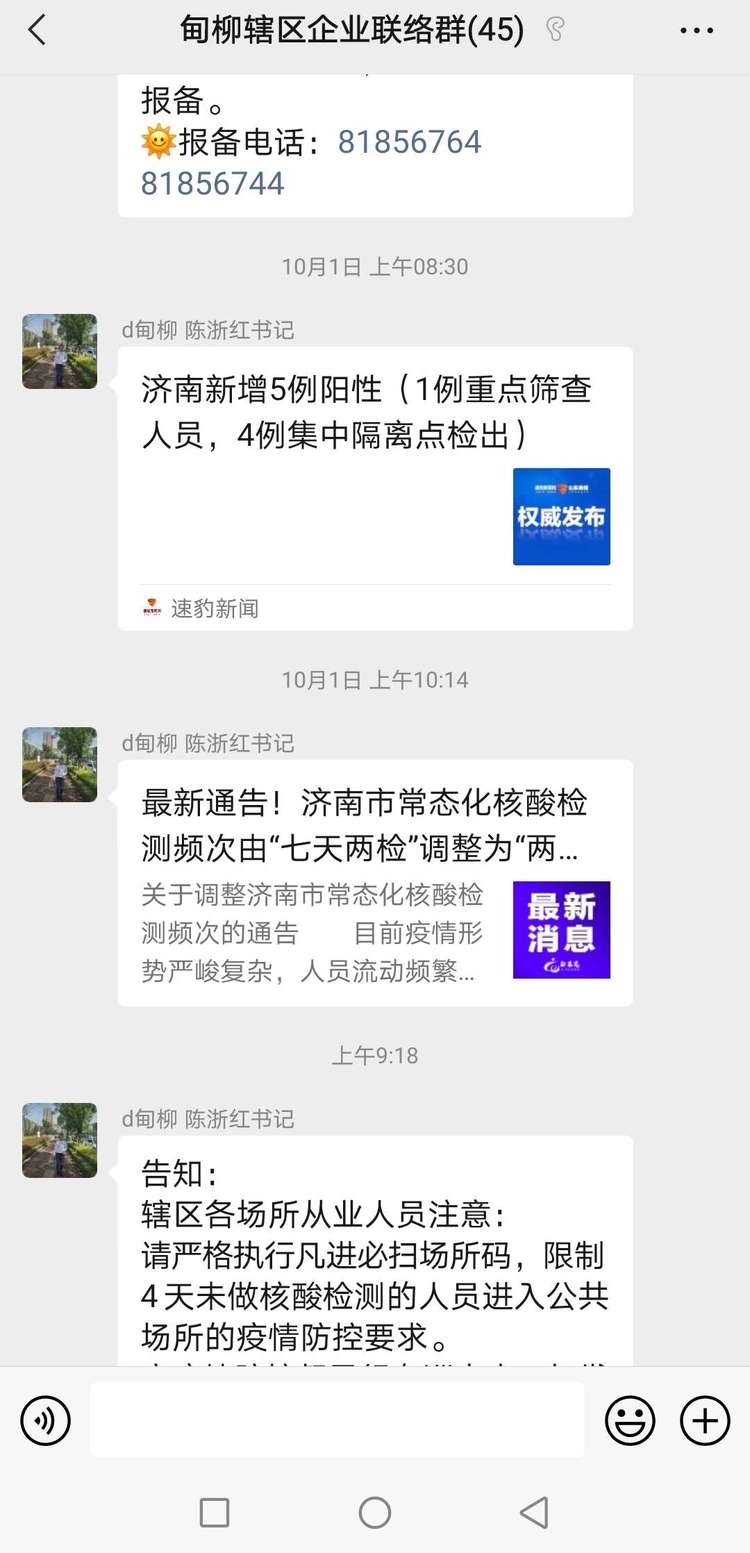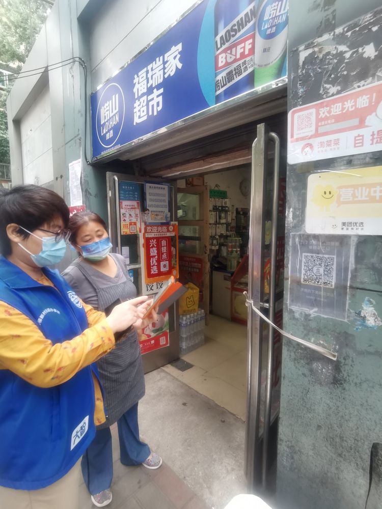 国庆假期中,辖区商户人流多。为稳固商户防疫意识,网格长陈浙红每天在辖区企业群进行防疫提示;网格员每天在辖区商户进行督促检查。