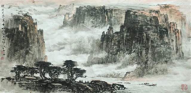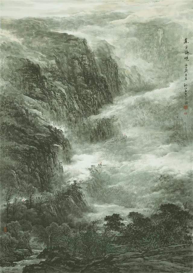 翻开胡江老师的画册,走进一片沉雄朴茂、大气堂堂的天地。山峰巍然矗立,高耸极天;云烟迷蒙氤氲,空灵清润;树木葱郁勃发,生机一片;点景人物寸小,融于山水之中。观画者不禁为画中的气象浑沦,元气淋漓所涤荡,唤起古今之间、天人之际的时间维度的深邃感与宇宙意识的辽阔感。这一切,来自于胡江老师善运黑白之道,挥胸中造化,蕴时代之气,融南北之风,创造出沉实苍润、朴茂清秀的胡江风格。